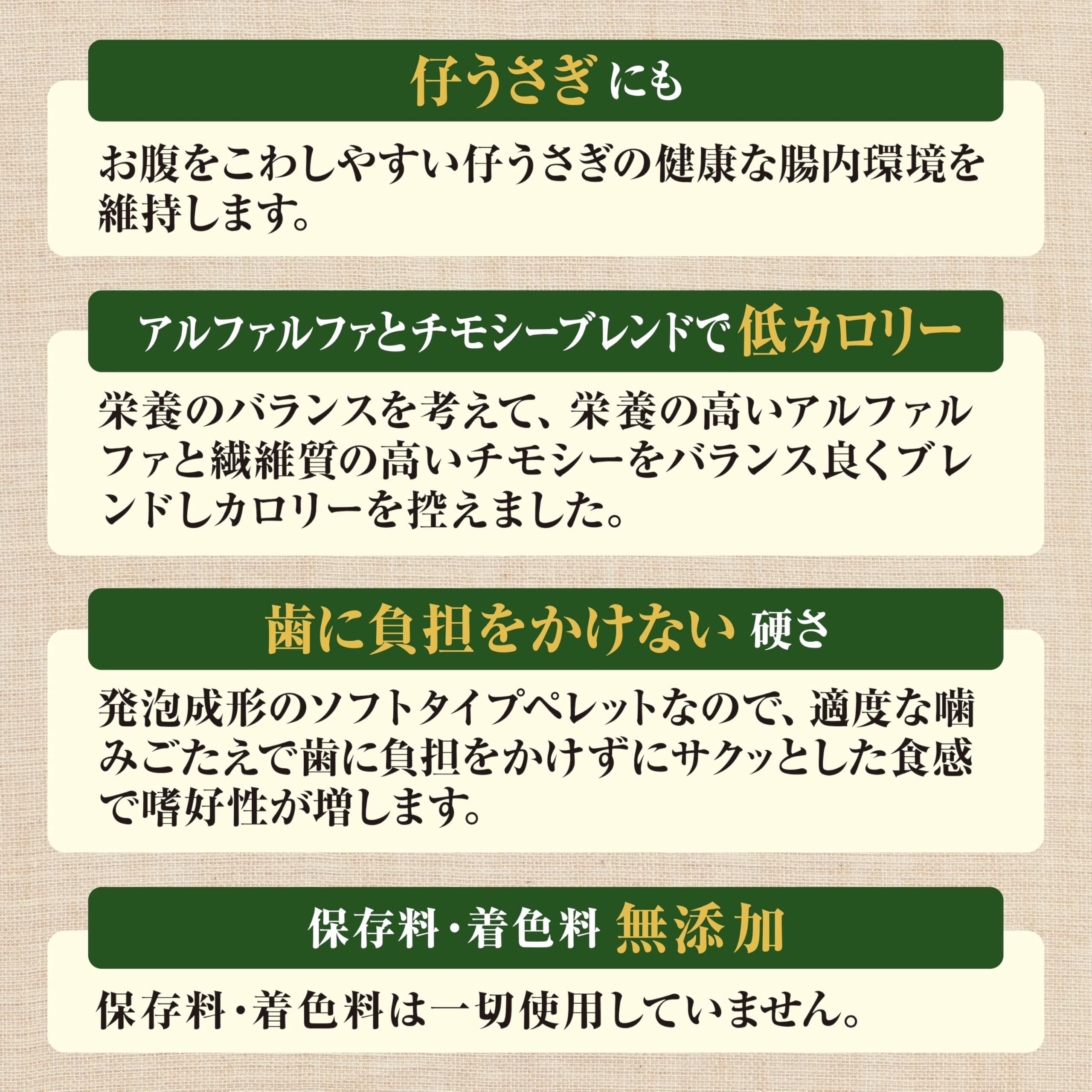 すべての原材料は厳選され、品質管理が行われているため、安心して与えることができます。愛うさぎの健康を守るため、信頼できるフードです。