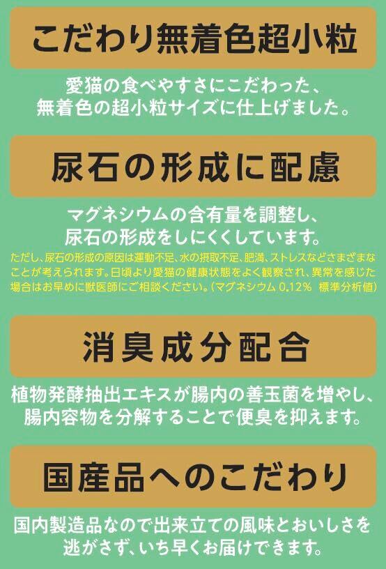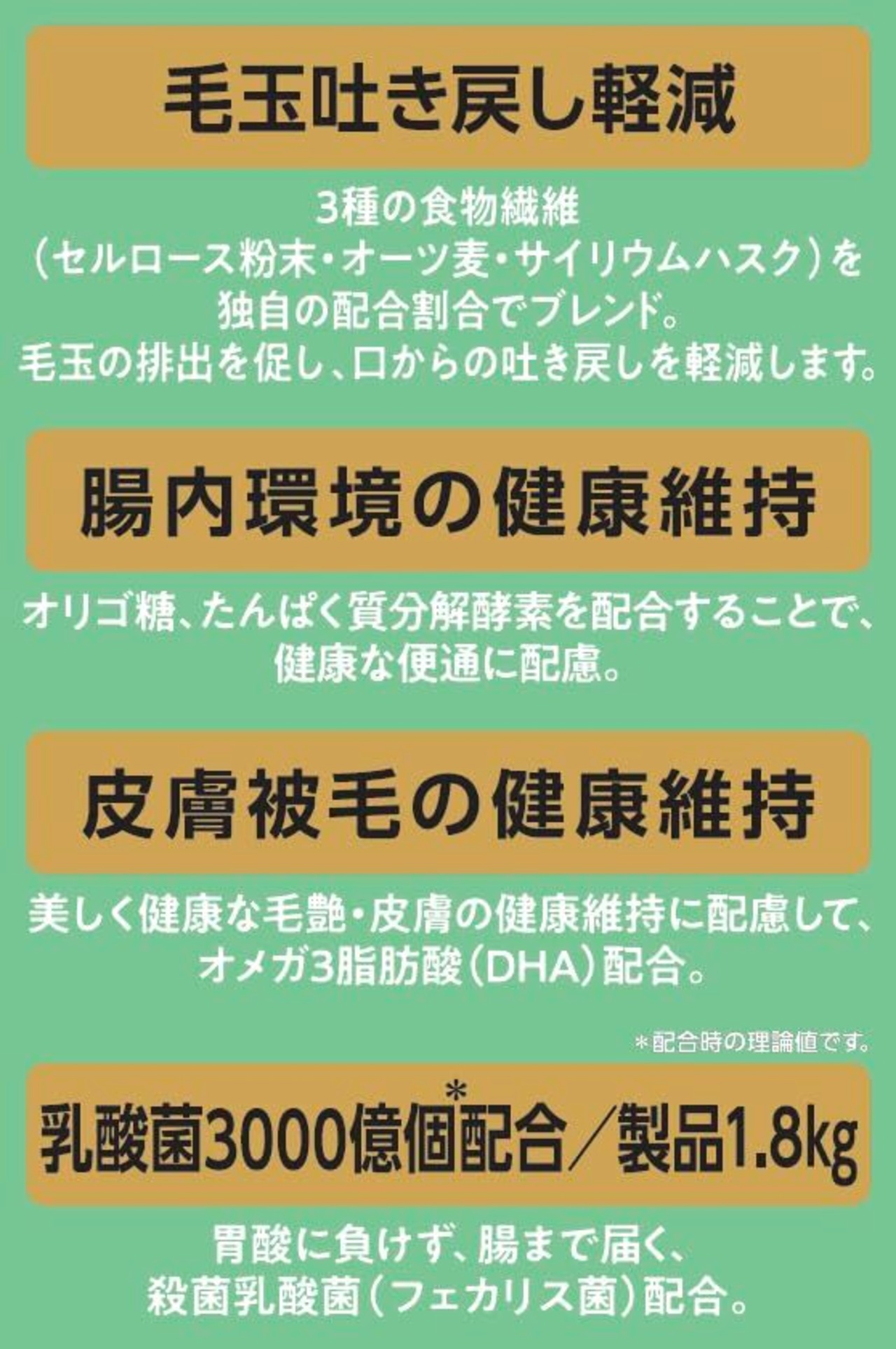 愛猫の食べやすさにこだわり、無着色の超小粒サイズに仕上げました。3種類の食物繊維(セルロース粉末・オーツ麦・サイリウムハスク)を独自の配合割合でブレンドすることで毛玉の排出を促すことで、口からの吐き戻しを軽減します。オリゴ糖、たんぱく質分解酵素を配合することで、健康な便通に配慮。 尿石の形成に配慮して、マグネシウムの含有量を調整(マグネシウム0.12%/標準分析値)。また、乳酸菌(フェカリス菌)を3000億個配合しました。(配合時の理論値です。) 植物発酵抽出エキスが腸内の善玉菌を増やし、腸内容物を分解することで便臭を抑えます。