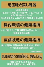 3種の食物繊維(セルロース粉末・オーツ麦・サイリウムハスク)を独自の配合でブレンド。毛玉の排出を促し、口からの吐き戻しを減らします。