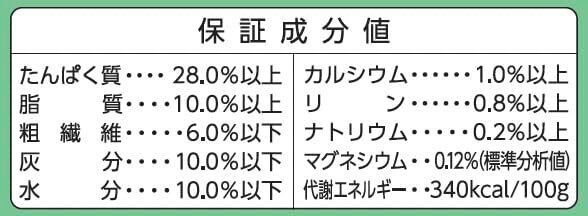 たんぱく質:28.0%以上 、脂質:10.0%以上、粗繊維:6.0%以下、灰分10.0%以下、水分:10.0%以下、カルシウム:1.0%以上、リン:0.8%以上、ナトリウム:0.2%以上、マグネシウム:0.12%(標準分析値)