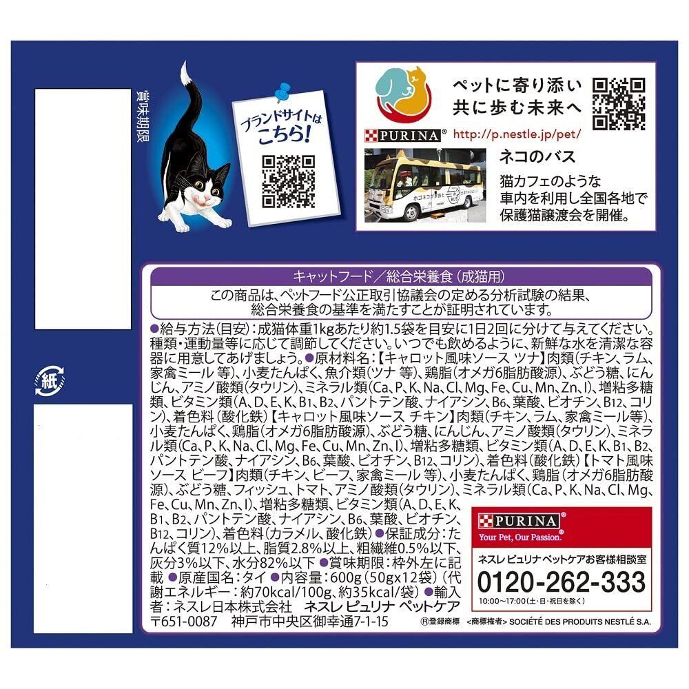 やわらかくほぐしたお魚やお肉のうまみに隠し味として食欲そそるソースをからめたごはん。 人気のツナ・チキン・ビーフの3種類が入ったバラエティパック。 使用方法 成猫体重1kgあたり 約 1.5 袋を目安に1日2回に分けて与えてください。種類・運動量等に応じて調節してください。いつでも飲めるように、新鮮な水を清潔な容器に用意してあげましょう。