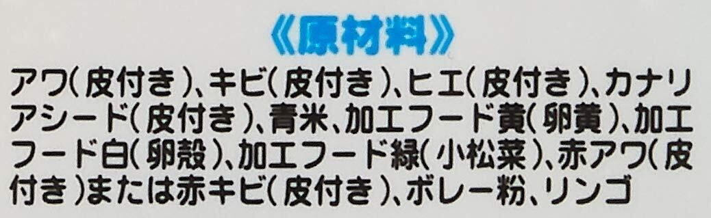 アワ(皮付き)、加工フード(卵黄、貝がら、小松菜)、カナリアシード(皮付き)、青米、ボレー、リンゴ