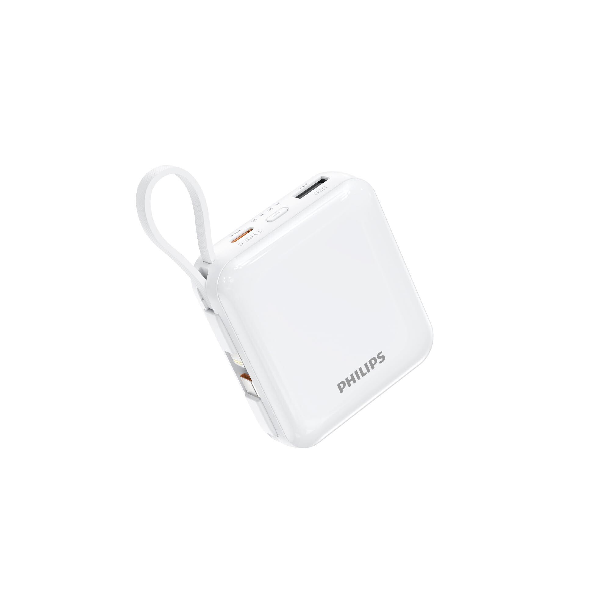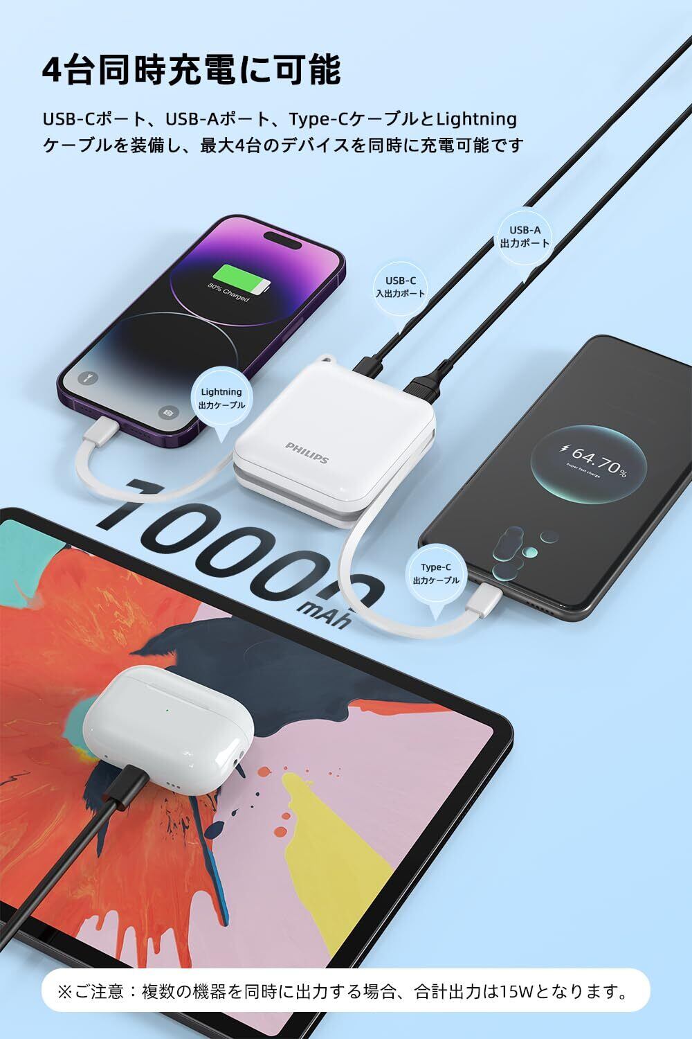 Philips (フィリップス) モバイルバッテリー 10000mAh 大容量 小型 携帯充電器 Lightning type-c ケーブル内蔵 22.5W タイプc ライトニング 4台同時充電 スマホ 持ち運び iPhone 16 / 15 Android iPad 各種機器対応 PSE認証済 ホワイト DLP5713CW