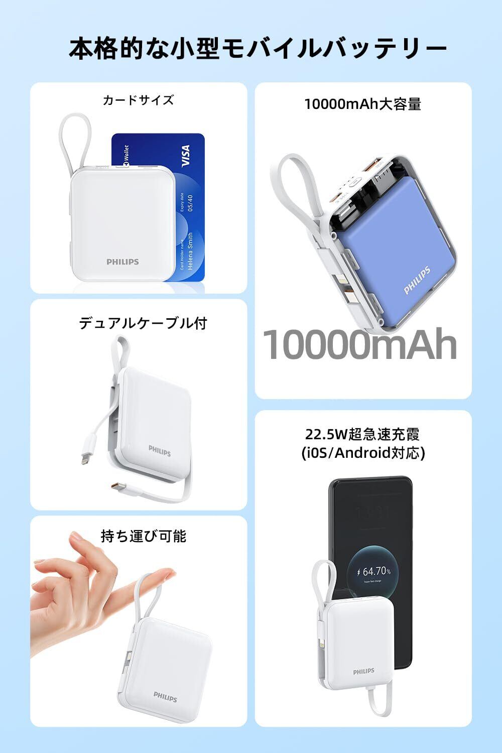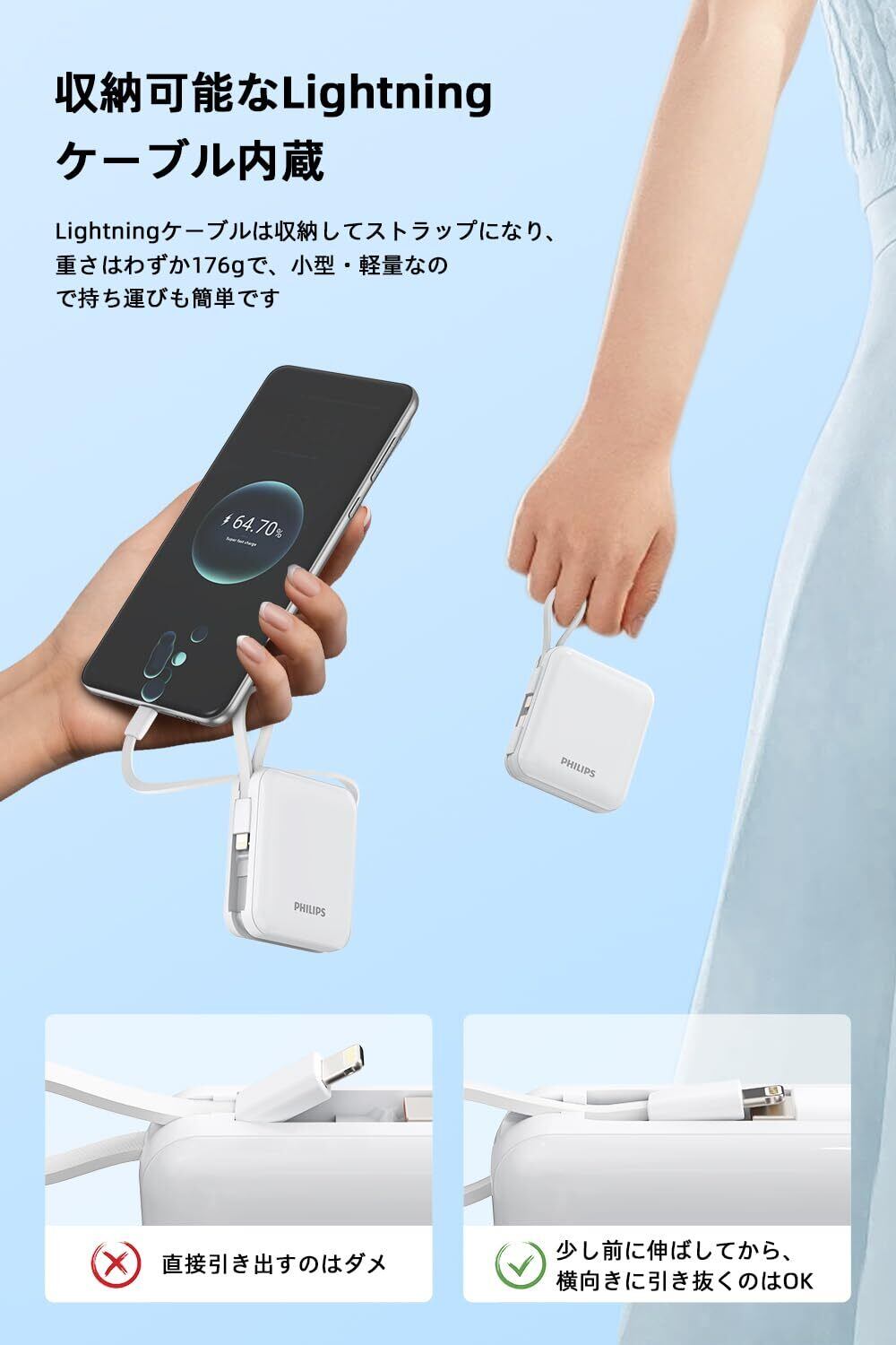 【カードサイズで携帯便利】 PHILIPS 超小型モバイルバッテリー新登場!6.65cmx2.55cmx7.4cmのミニボディ、手のひらサイズでポケットやカバンにもすっぽり収まります。 重さはわずか176gで、手に持っても負担になりません。歩きながら充電する必要がある方には、間違いなくおすすめのアイテムです。