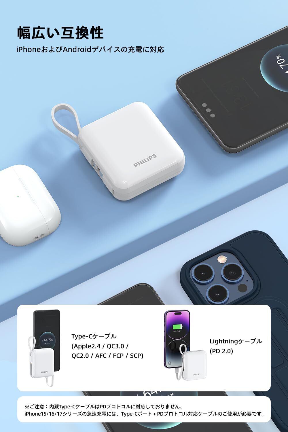 【収納可能なケーブル&幅広い互換性】 収納可能なライトニングケーブルとタイプcケーブルを内蔵しており、デバイスを充電するときはケーブルを抜き、充電しないときは収納しておくことができます。Type-CケーブルはiPhone 15 / 16 / 17シリーズとAndroidデバイスを、LightningケーブルはiPhone 14 / 13 / 12以下を充電します。usb-cケーブル対応のプロトコルはApple2.4 / QC3.0 / QC2.0 / AFC / FCP / SCPで、最大約22.5Wの高速出力があります。ライトニングケーブル対応のプロトコルはPD 2.0で、約最大19.98Wの高速出力になり、iPhone 14 / 13 / 12シリーズとAndroidデバイスの両方に急速充電が可能です。内蔵Type-CケーブルはPDプロトコルに対応しておりませんので、iPhone 15 / 16 / 17シリーズへの急速充電ができません。購入する前にあらかじめご了承くださいませ。
