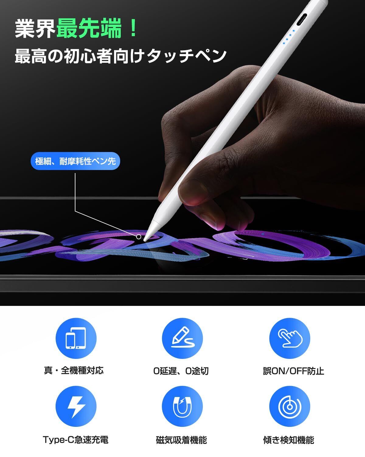 【二重磁気吸着構造 & 使いやすさ】KINGONE iPad用ペンシルは、二重強固磁気吸着機構を採用し、いつでもどこでも安全に使用できます。ノートを取ったり、スケッチのアイデアを練ったりする際に、紛失や置き忘れを心配することなく、便利且つ迅速に作業を行えます。ペアリング不要のスマホスタイラスペンで、Bluetoothフリーなしで簡単に操作でき、スイッチを軽く2回タッチするとON/OFFができます。 4つのLEDを搭載し、バッテリー残量が一目で確認できます。 超軽量13.5gなので、長時間の作業でも手が疲れません。 ※ご注意:磁気吸着機能対応: iPad Pro 12.9"、iPad Pro 11"、iPad Air 第4/5世代、iPad mini第6世代。磁気吸着機能非対応: iPad Pro 13/11 inch(M4)、iPad Air 13/11 inch(M2)、iPad第6/7/8/9/10世代、iPad Air第3世代、iPad Mini第5世代。