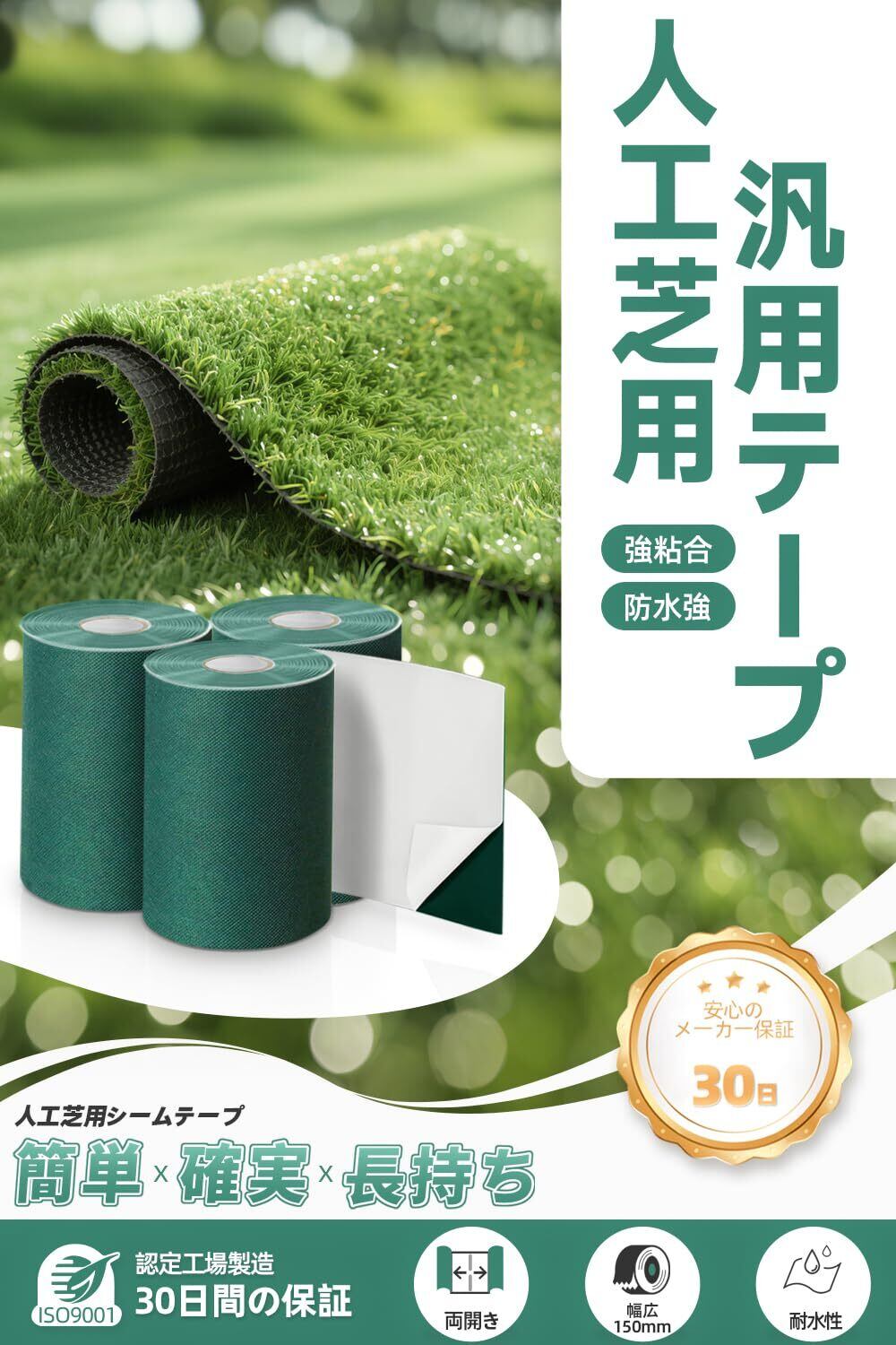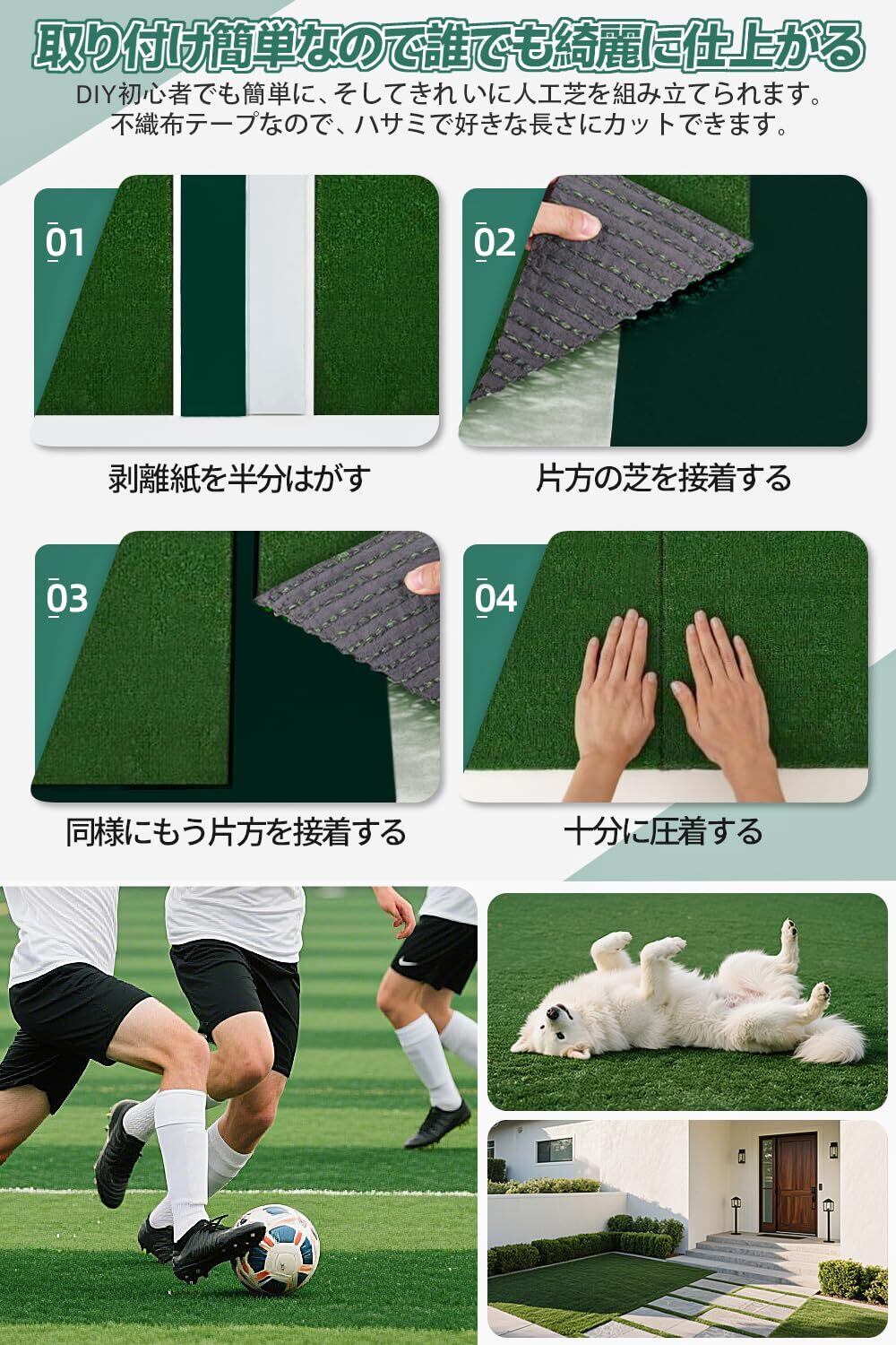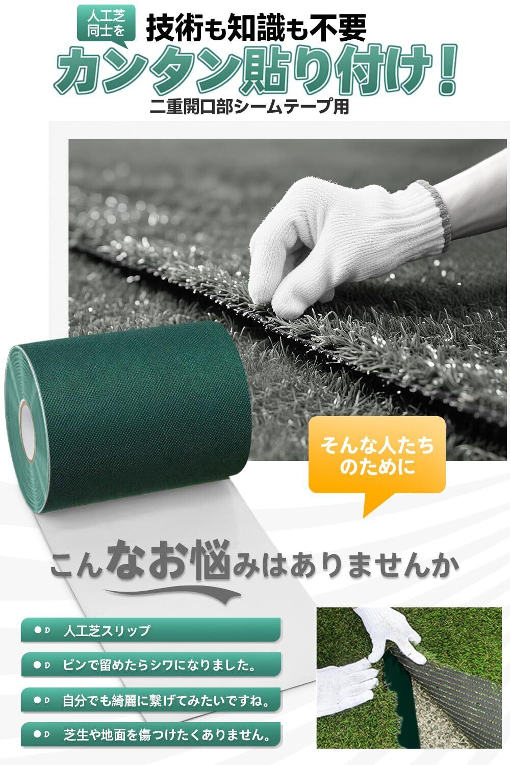 庭や公園、イベントなど様々な場所での使用が可能。人工芝の美しさを保ち、スムーズな接続をサポートするこのテープをぜひご活用ください。