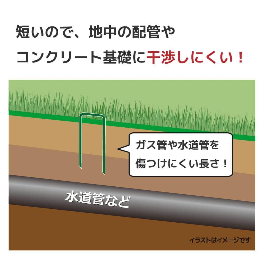 ■ 【特徴】 緑色なので人工芝の押さえピンとして目立たずに固定できます。やわらかい土や強風時のあおりによる人工芝のズレを抑えます。当社従来品よりもピンの長さが短く、土中の配管や基礎を傷つけにくい!さらに剣先タイプで差し込みやすい!