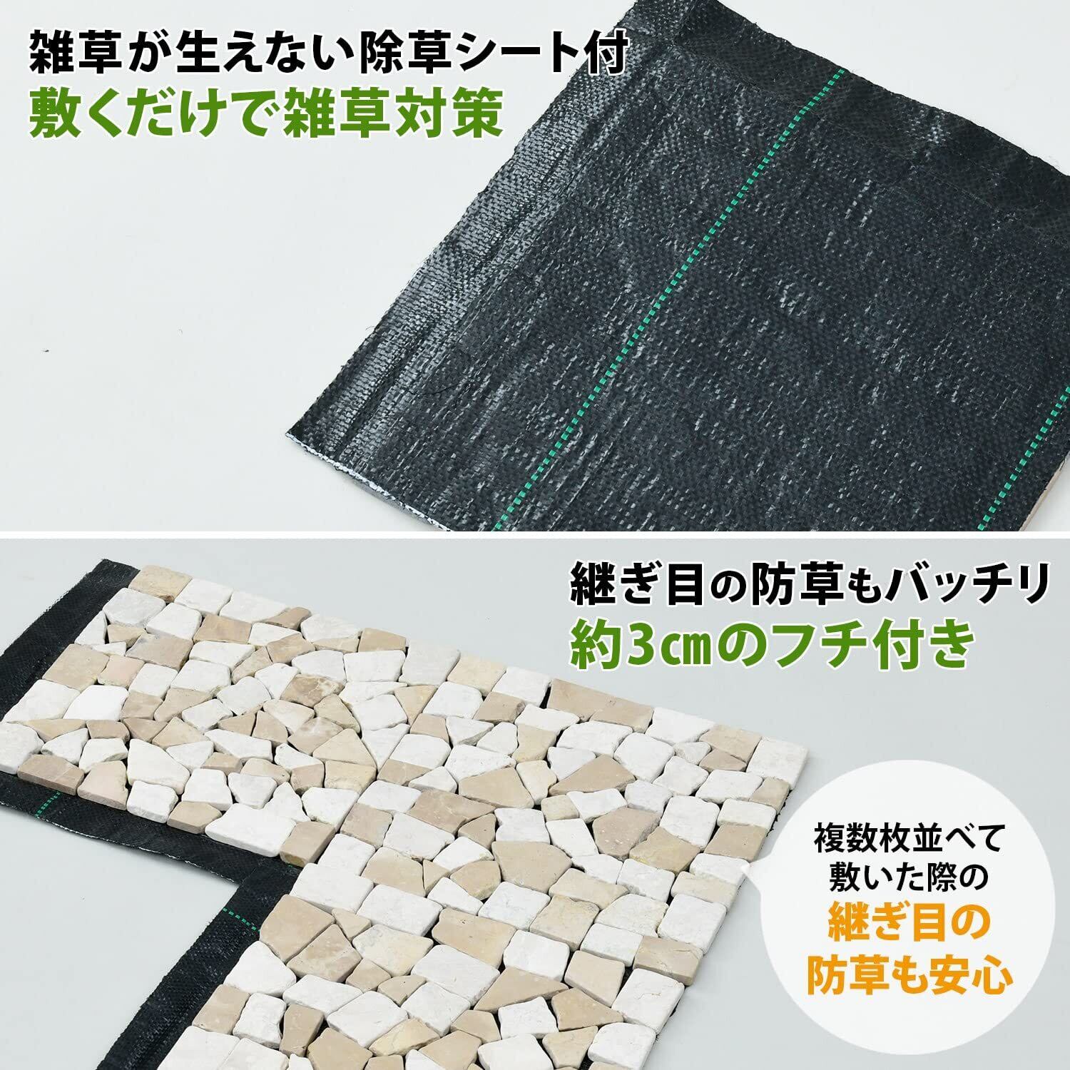 【除草シート付き】雑草が生えない除草シート付きのマットで簡単に防草対策。除草シートは天然石マットに対して約3㎝のフチ付きなので、複数枚並べて敷いた際の継ぎ目の防草もバッチリ。