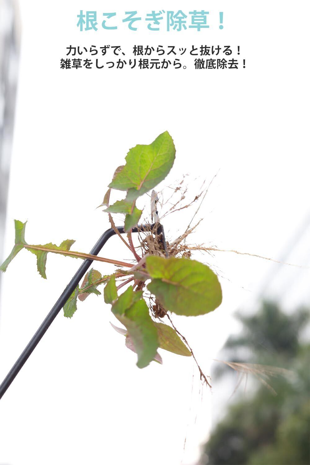 【簡単に根こそぎ除草】三本の歯を土に差し込み、根元近くまでしっかり入り込んで抜き取ります。表面の土もほぐれ、排水性が向上します。誰でも簡単に使えて、効率よく除草作業ができます。