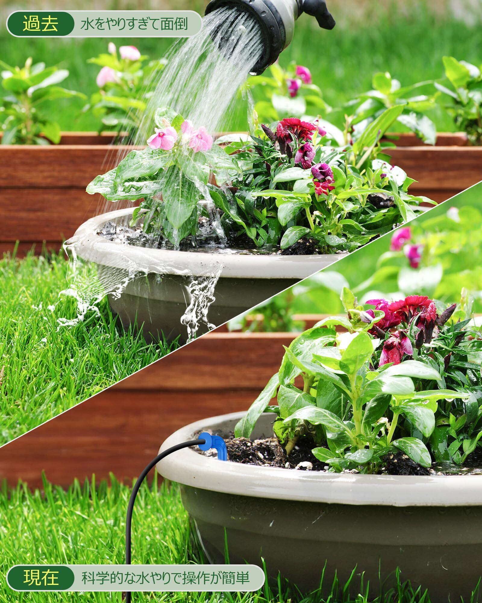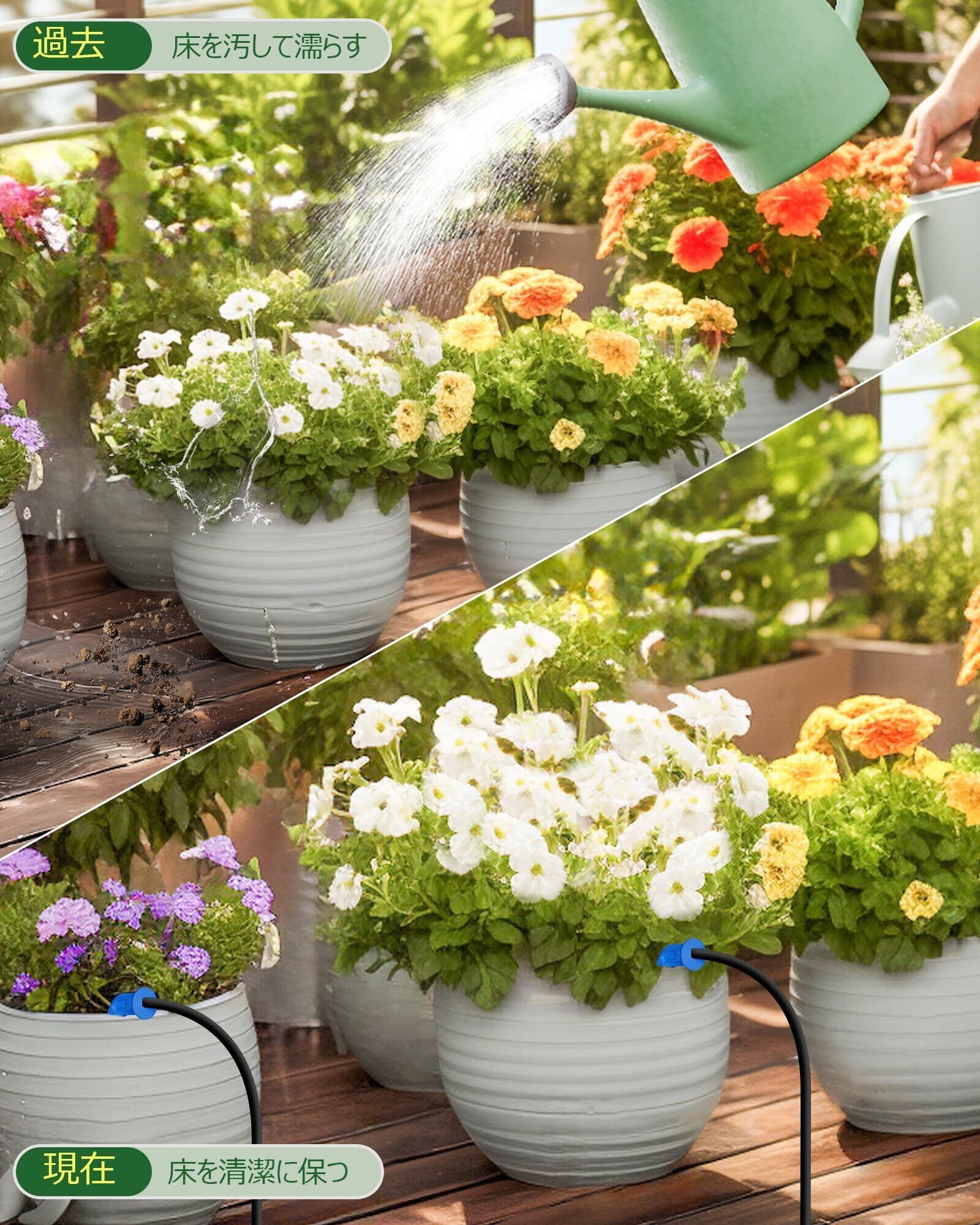 最大15鉢まで同時自動散水:付属の15m長ホースと複数ノズルで、鉢植えや花壇に効率的に水を分配。植物の数や配置に合わせて自由にレイアウト可能。