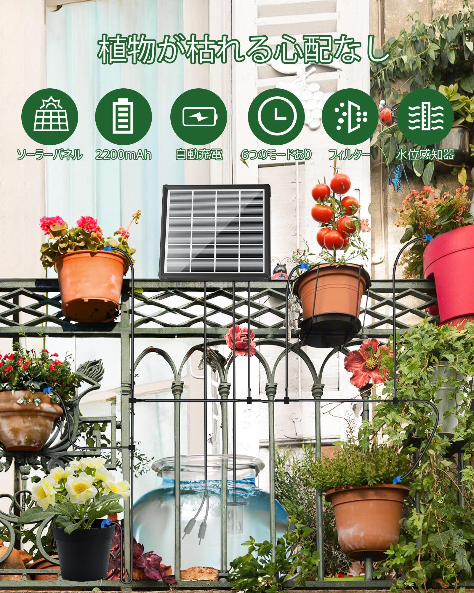 ソーラー充電&バッテリー内蔵で電源不要:太陽光で動作し、2200mAhの大容量バッテリーを搭載。曇りや雨天時でも最大3~5日間連続給水可能。水道や電源のないベランダ・庭でも簡単設置。