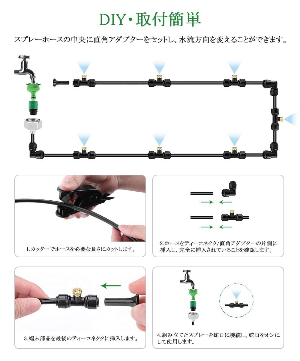 【装着簡単】散水ホースセットは10m/20m/30mメートルで、必要に応じて自由に長さをカスタマイズできます。スプレーホースの中央に直角アダプターをセットし、水流方向を変えることができます。このミストシステムは一度に異なる植物の水需要を満たすこ とができます。ほとんどの家庭用水圧に適しています。結束バンドも付属しているので、柵や竿に設置してご使用いただけます。