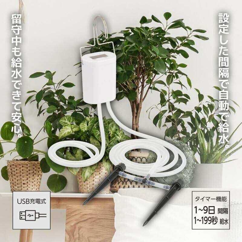 植物のお世話をもっと簡単にする【2022最新】オーム自動給水機:本商品は、充電式でどんなスペースでも手軽に使用できる自動水やり機です。決まった時間に自動で水やりを行うので、忙しいあなたのガーデニングライフを強力にサポートします。