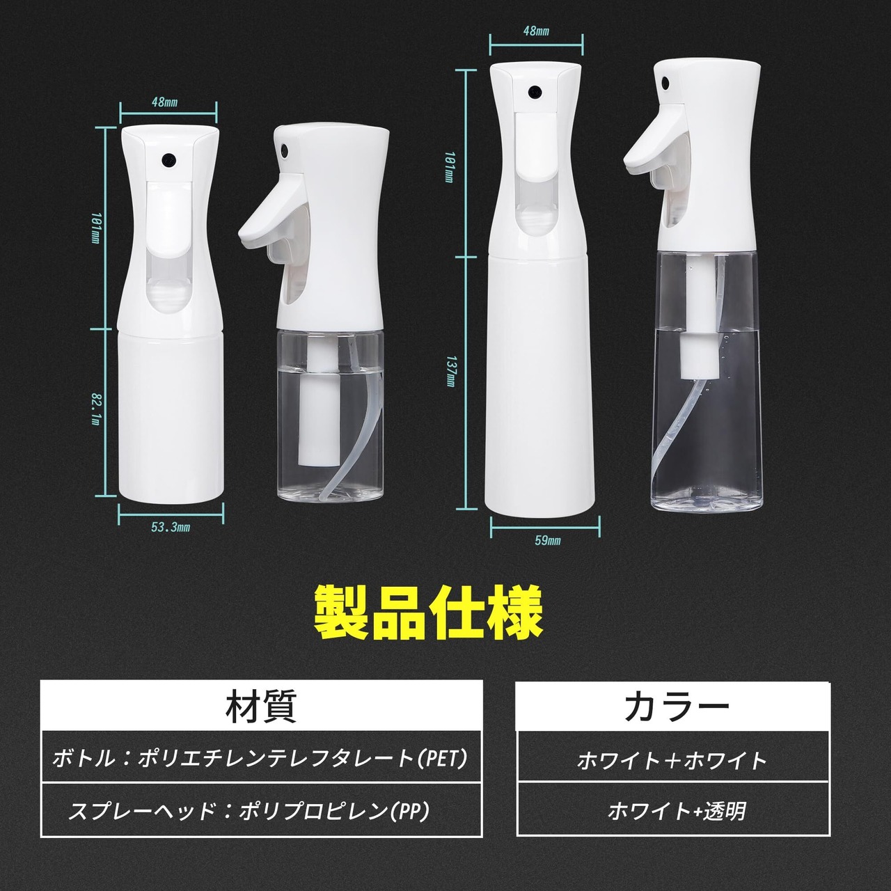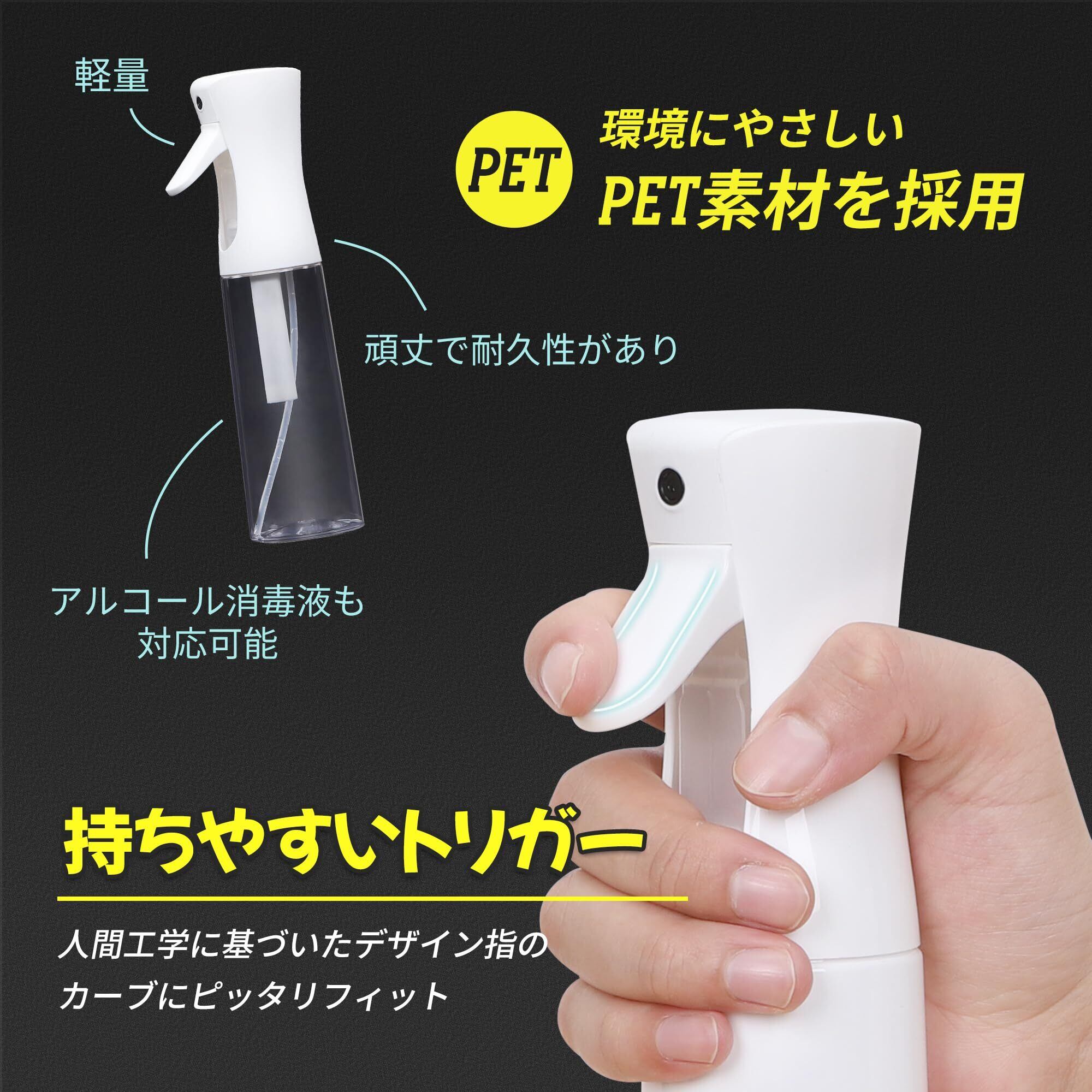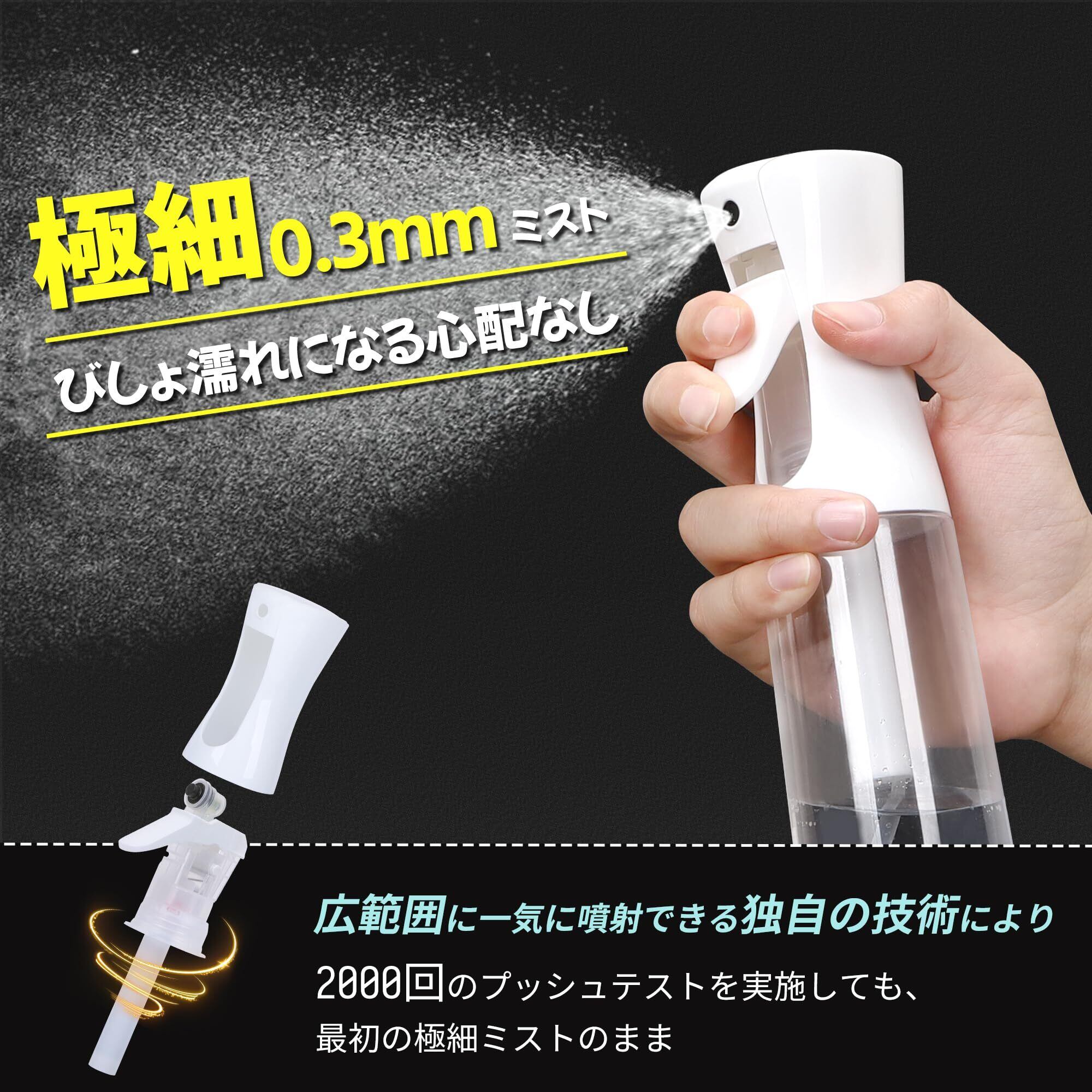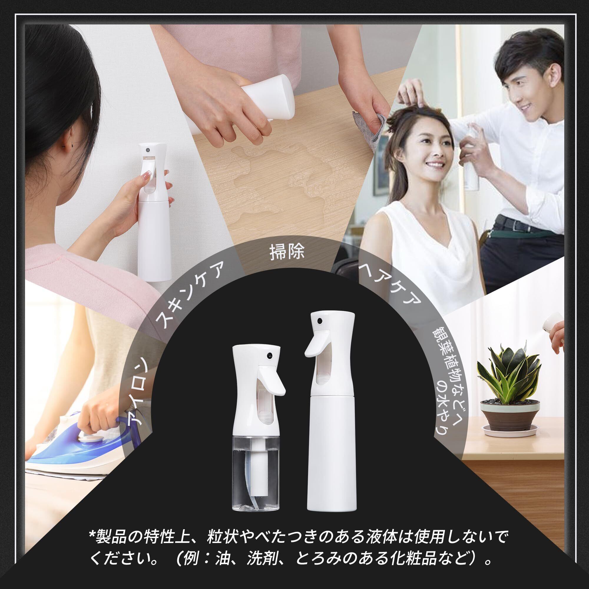 【幅広い用途】霧吹きは160mlと300mlの容量があり、空気圧を利用しており、容量のすべてを残さずに使いやすい。ヘアケアや化粧水・掃除用液体や消毒・植物への水やりなどさまざまな用途に活用できる。