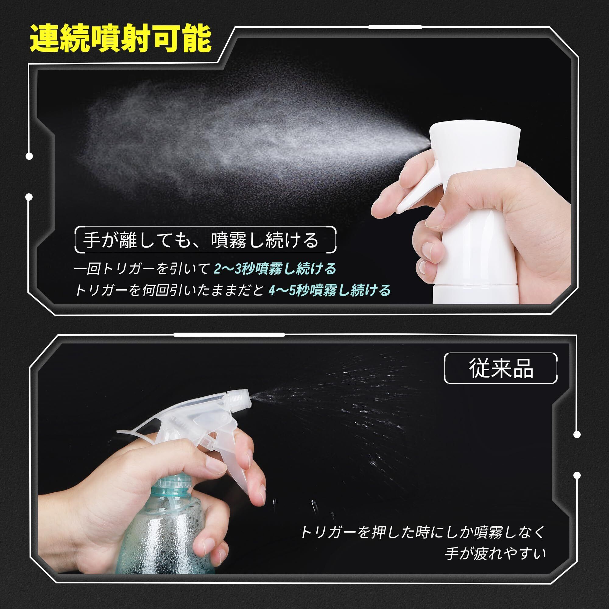 【連続ミスト噴射可能】独自の技術で連続噴射が可能なので、広範囲に一気に噴射できる。ワンプッシュで煙のような微細なミストを1~2秒噴射できて、レバーを引いたままだと4~5秒噴霧し続ける。一般的なスプレーボトルと比べて噴射時間が長い。