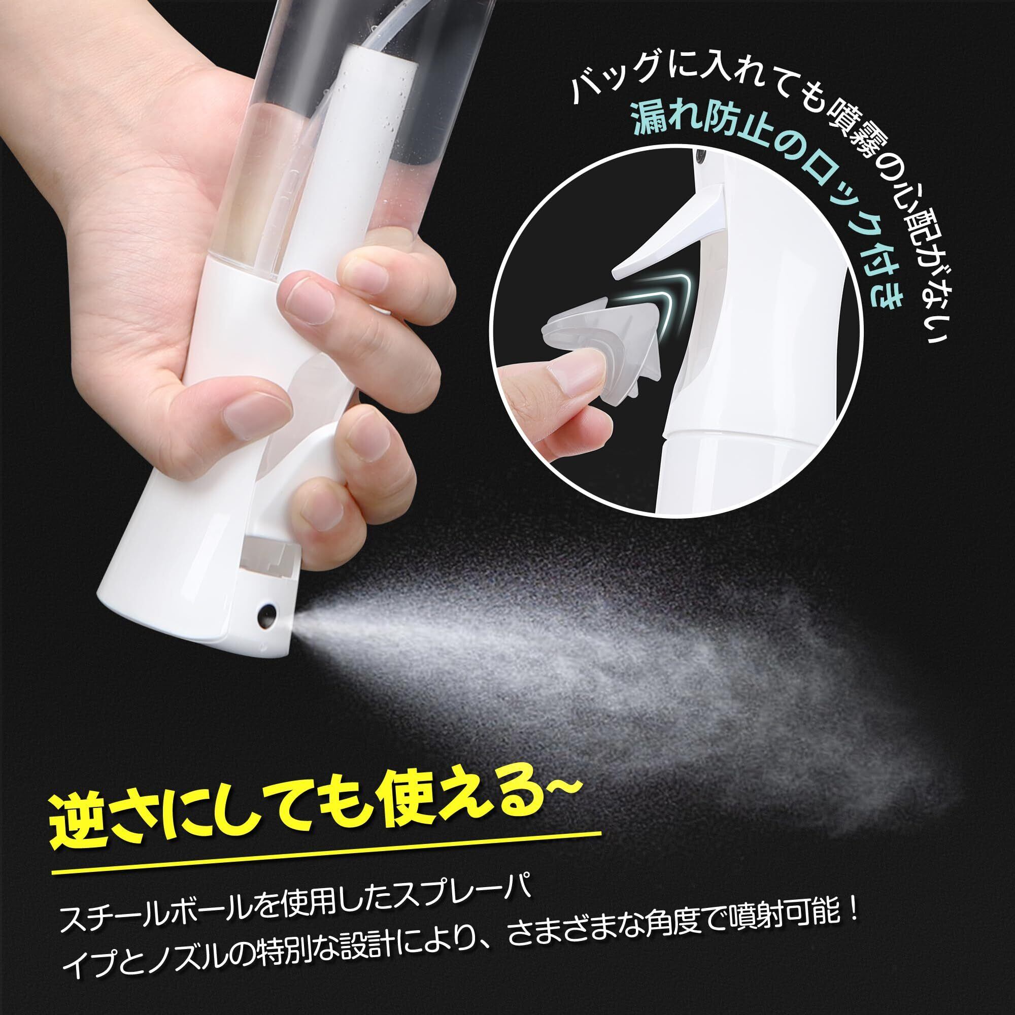 【極細0.3mmミスト】0.3mmの細かいミスト噴射が可能なスプレーボトル。広い範囲を迅速かつ簡単にカバーでき、びしょ濡れになる心配が少ない。スチールボールを使用したスプレーパイプとノズルの設計で、あらゆる角度で噴射可能。ボトルを逆さにしてもスプレーでき、吹きかけたい場所を選ばずに使用できる。