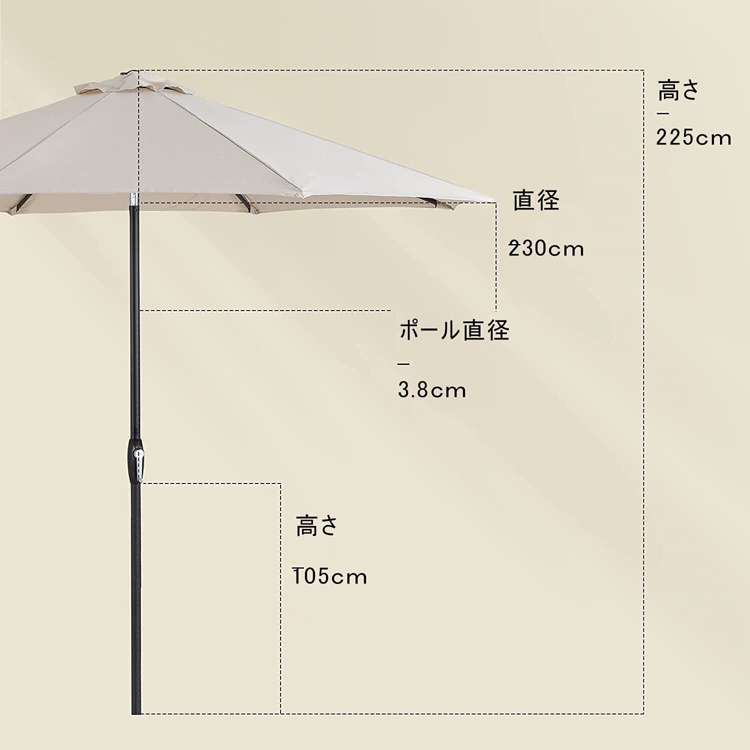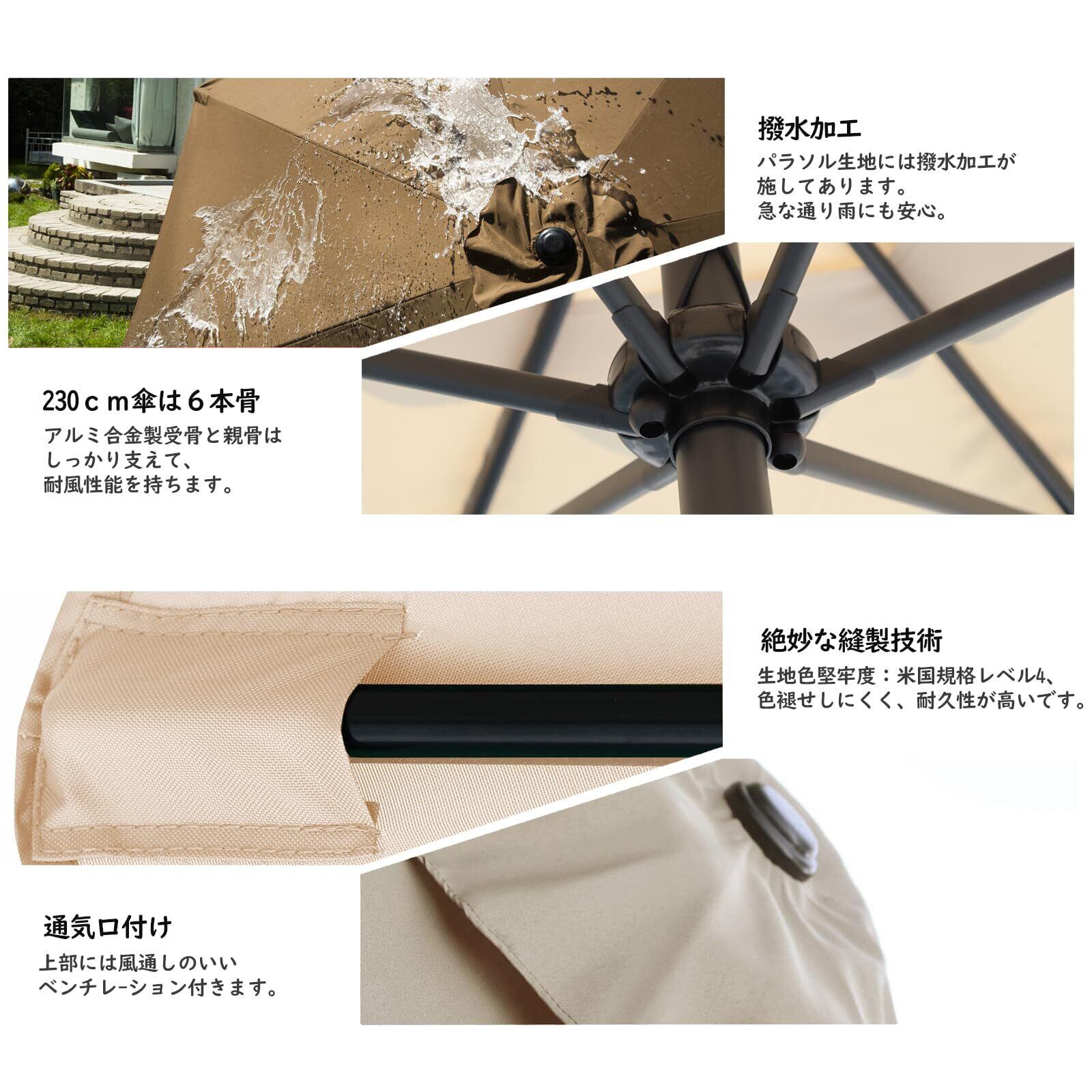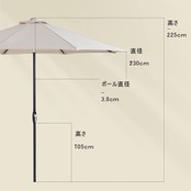 製品仕様:【色】クリーム 【傘骨】6本 【組立時サイズ(約)】 直径230x高さ225cm【重量(約)】3.65kg 【 ポールの直径(約)】38mm 【傘生地】100%ポリエステル(200g/m²) 【骨組み】Al-Fe合金(合金骨組みは粉体塗装)
