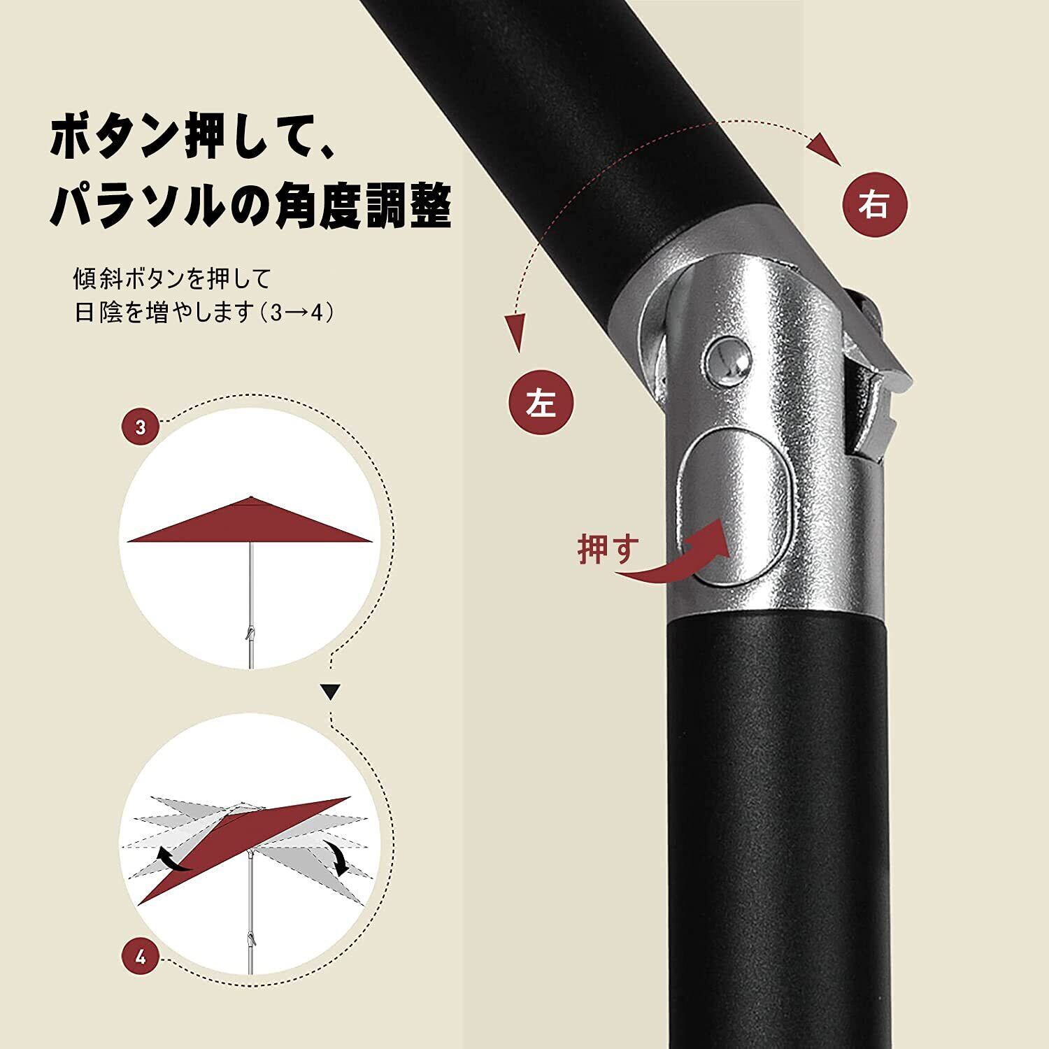 使用簡単:アルミ製の支柱は木製パラソルと比べると軽くて、力に自信のない方でも比較的楽に持ち運びや設置することができます。パラソルの開閉には、普通の傘とは違いハンドル式を採用、クルクルと回すだけで開閉できるので、これほど大きなパラソルでも女性一人で簡単に開閉できます。