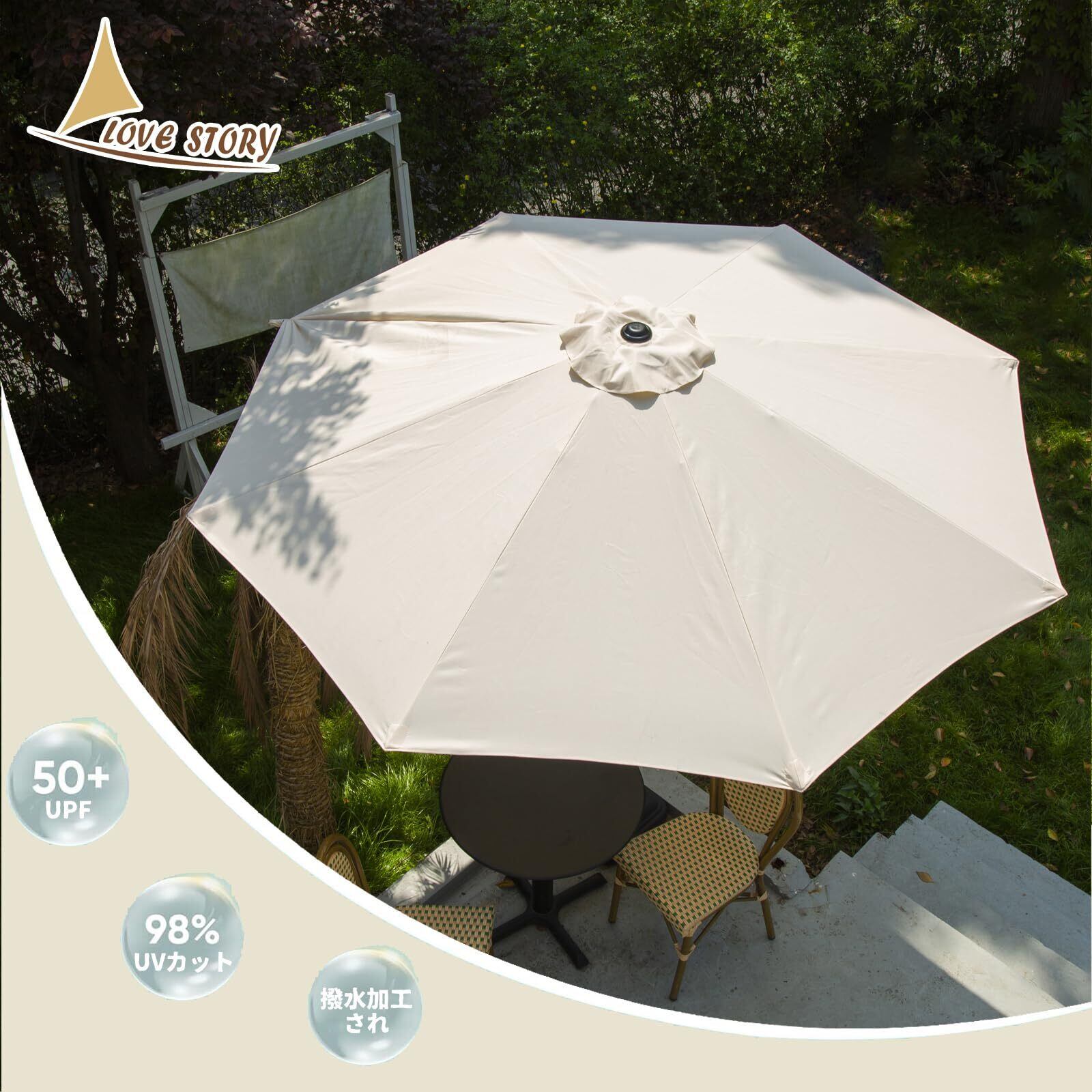 LOVE STORY推奨: LOVE STORY パラソルは、芝生、ポーチ、庭、ビーチ、プール、ピクニック テーブル、カフェ、レストランなどのパティオ ショップに最適です。夜間と悪天気時には傘を閉めて保管することをお勧めします。【ご注意】パラソルのみ、ベースは付属いたしません。