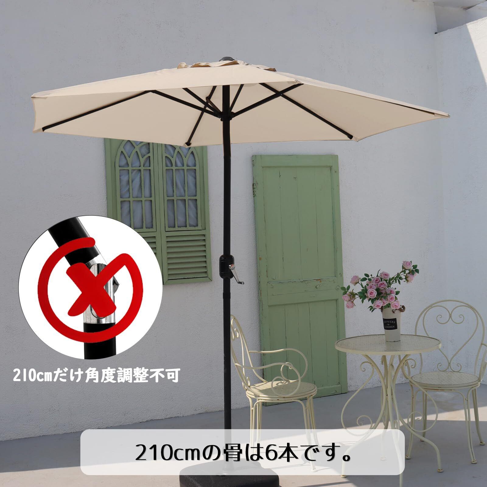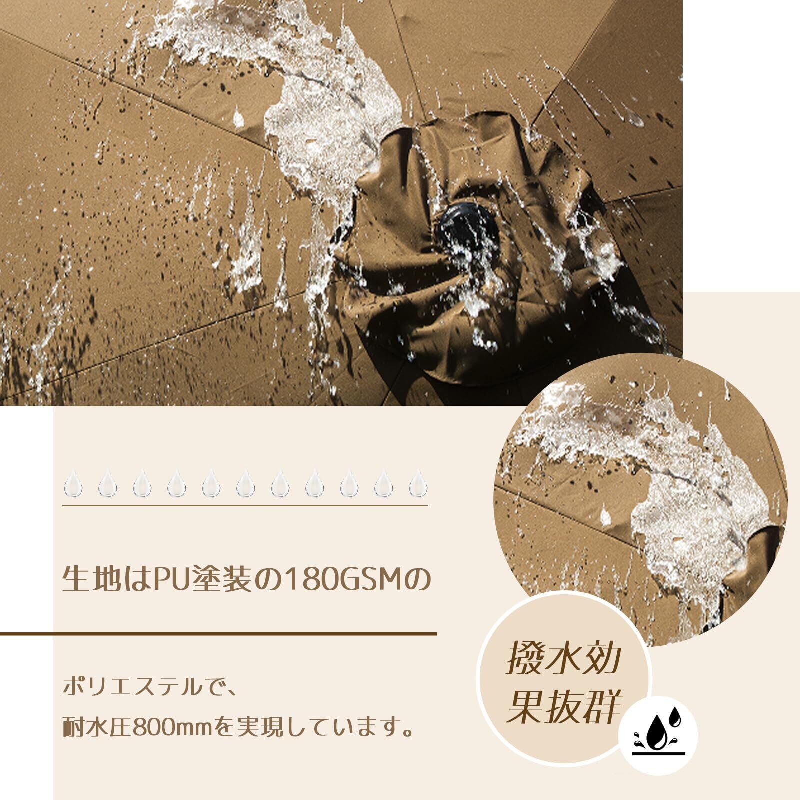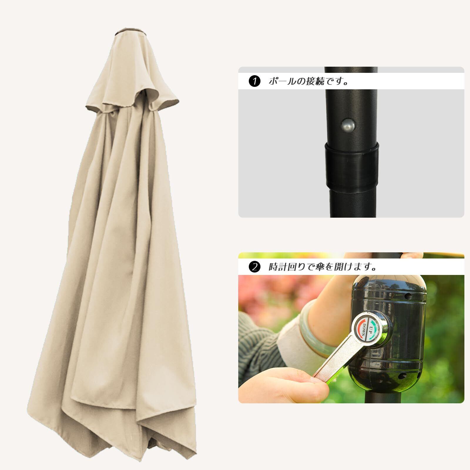 【風に強い設計】強風に耐えるパラソル骨組みを採用しています。風にしっかりと対応できる設計になっており、安心して屋外でお使いいただけます。撥水加工の生地は、軽い雨からもしっかりと守り、快適なガーデンライフを提供します。