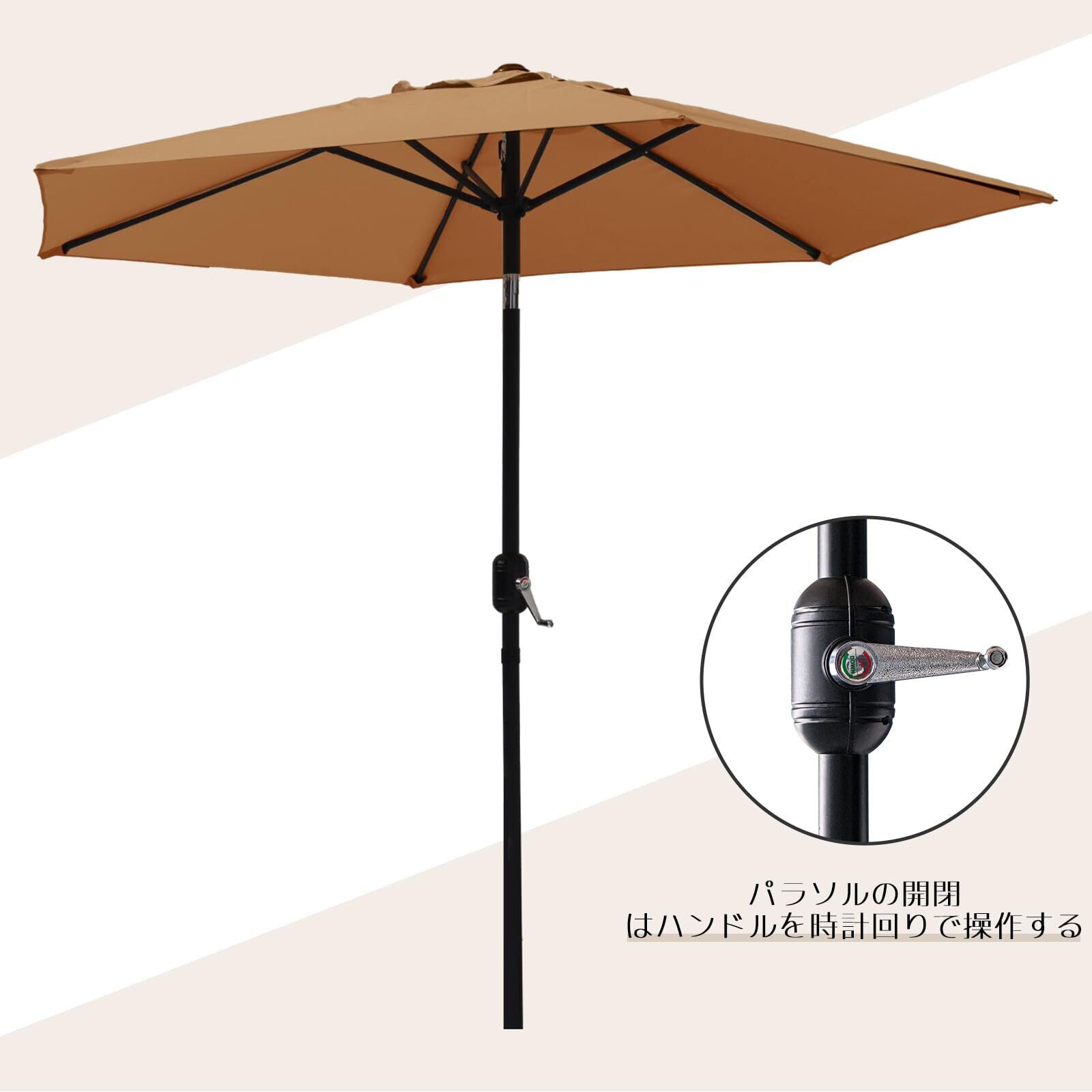 【便利なハンドル式開閉】パラソルの開閉には回転ハンドル式を採用しており、簡単に操作できます。力がない方でも楽に開け閉めできるので、女性やお子様にも優しい設計となっています。お手入れも簡単で、使用後は収束してコンパクトに収納できます。