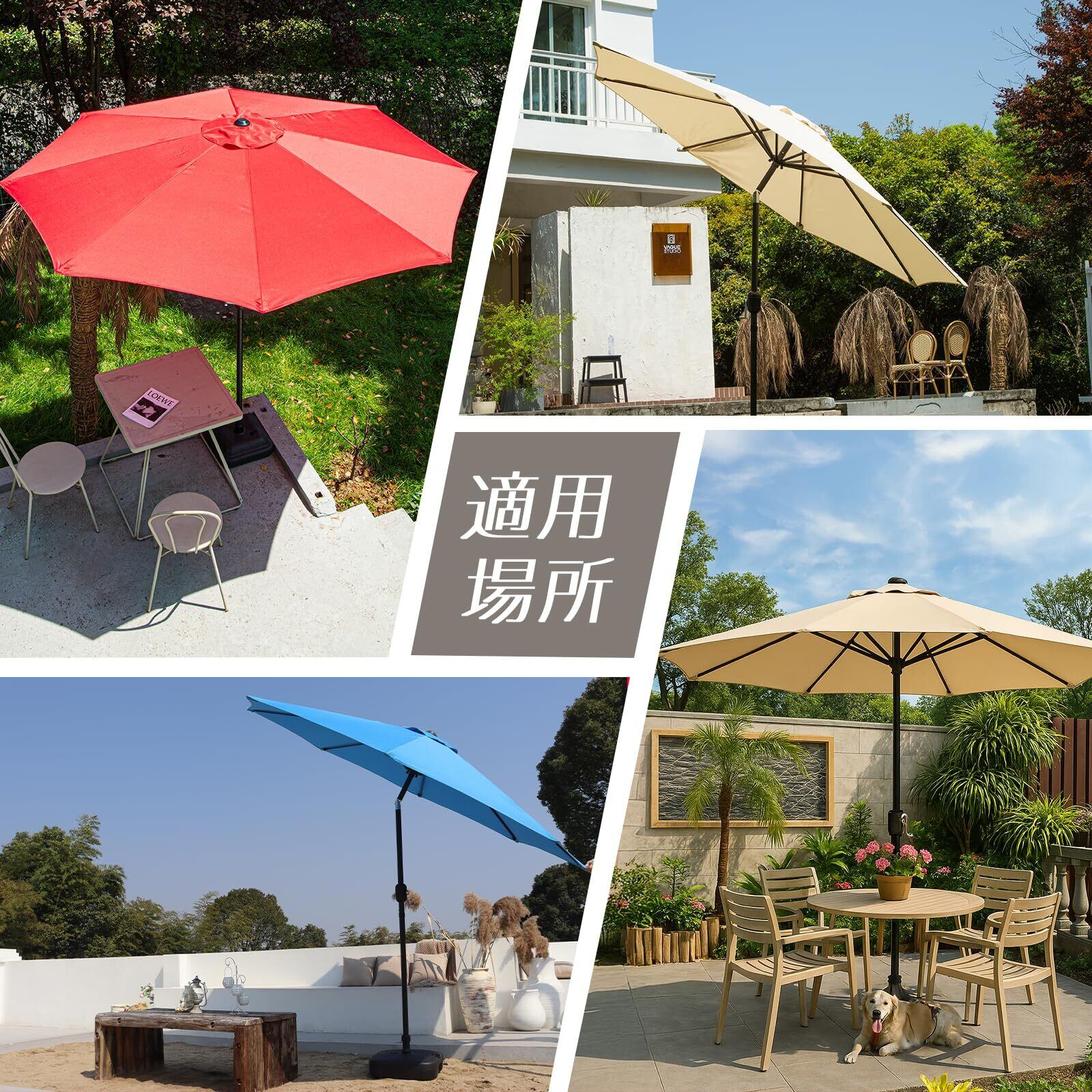 【多様な利用シーン】本商品は、庭、バルコニー、ウッドデッキ、カフェ、テラスなど、様々な場所でお使いいただけます。日差しを遮ってくれるパラソルで、心地よい日陰を作り出し、アウトドアでの時間を快適に過ごすことができます。