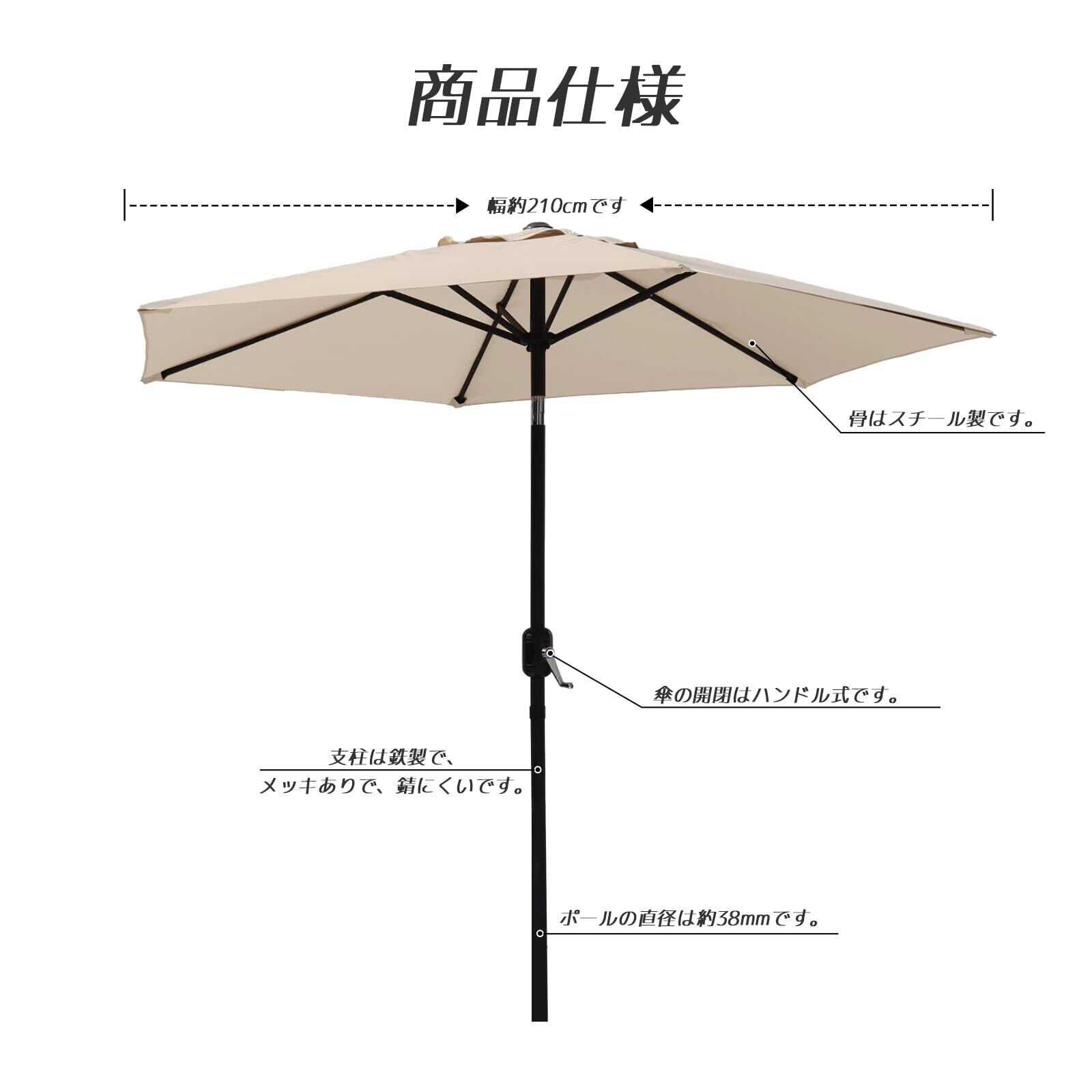 【商品仕様】パラソル本体のみ(ベースは含まていません)。展開時傘直径約210cmで、収納時サイズ約124x13.5x13.5cmです。ポールの直径は約38ミリです。