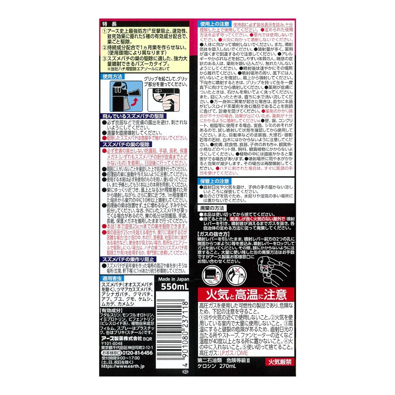 スズメバチに効く反撃阻止、速効性、致死効果に優れた5種の有効成分配合