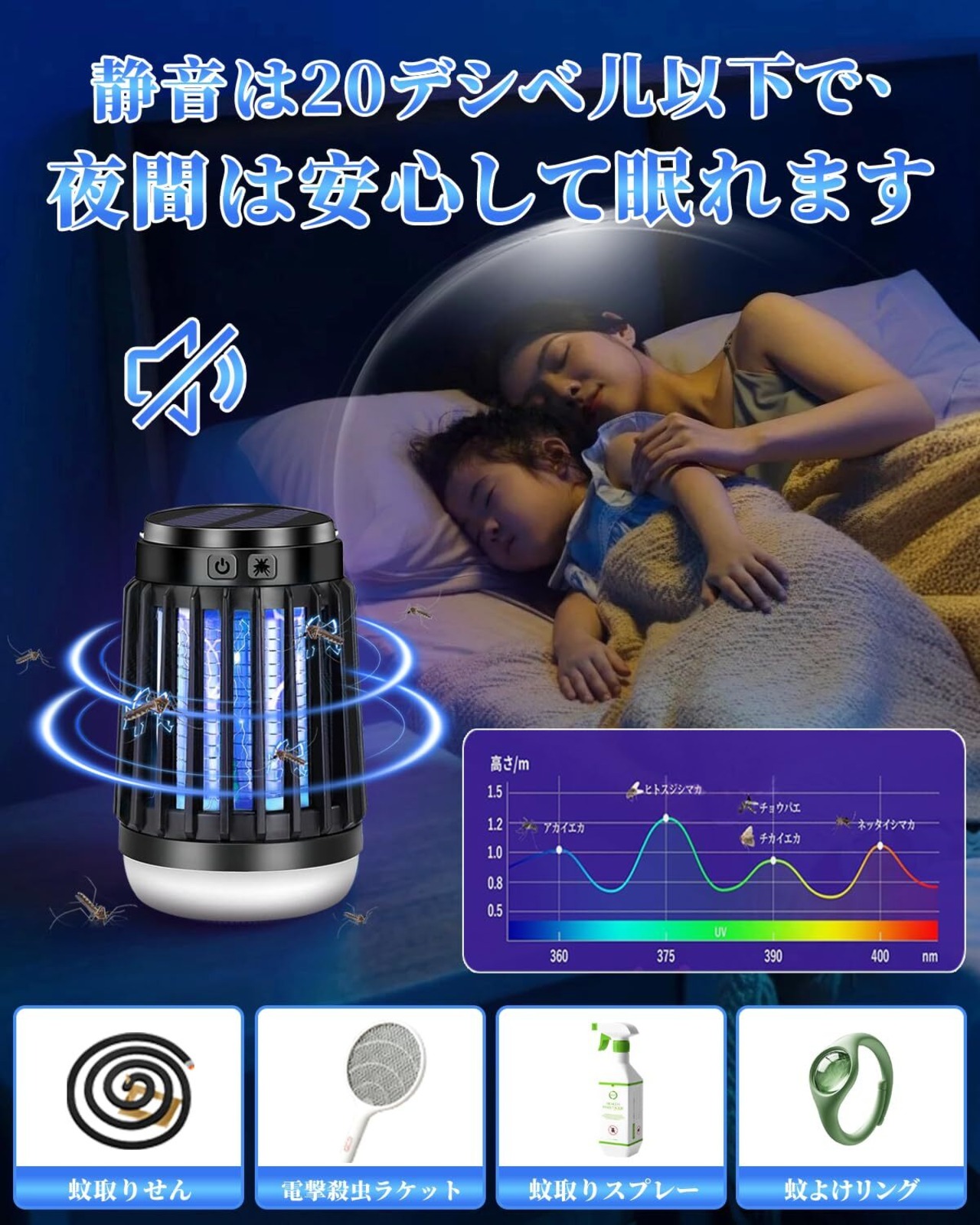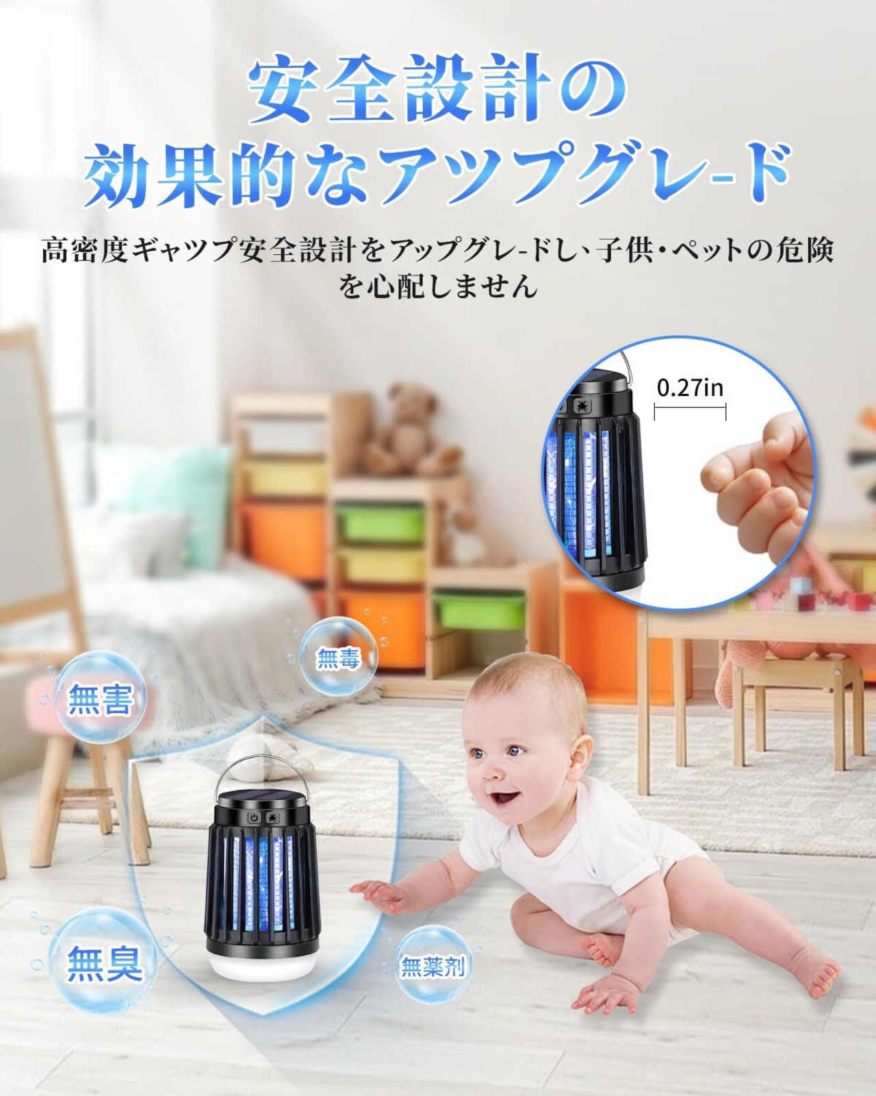 【物理蚊除け・薬剤不使用・安全設計】AI誘捕システム、360°全方位UV光源吸引式なので、物理的に蚊を殺します、 由于不使用任何化学物质,杀虫灯在工作时不会散发任何气味、烟雾或有害化学物质,パシッとなどの騒ぎがなしに、火もなしに、内部には密集な静電ネット式な設計なので、虫などを逃げられないです。電撃殺虫器は高品質で環境保護ABS素材を採用し、高密度のシェルギャップは6mmであるため、指が高電圧ネットに誤って触れるのを効果的に防ぐことができます。妊婦さんと赤ちゃんと犬・猫などのペットがいるご家庭でも安心してお使いいただけます。