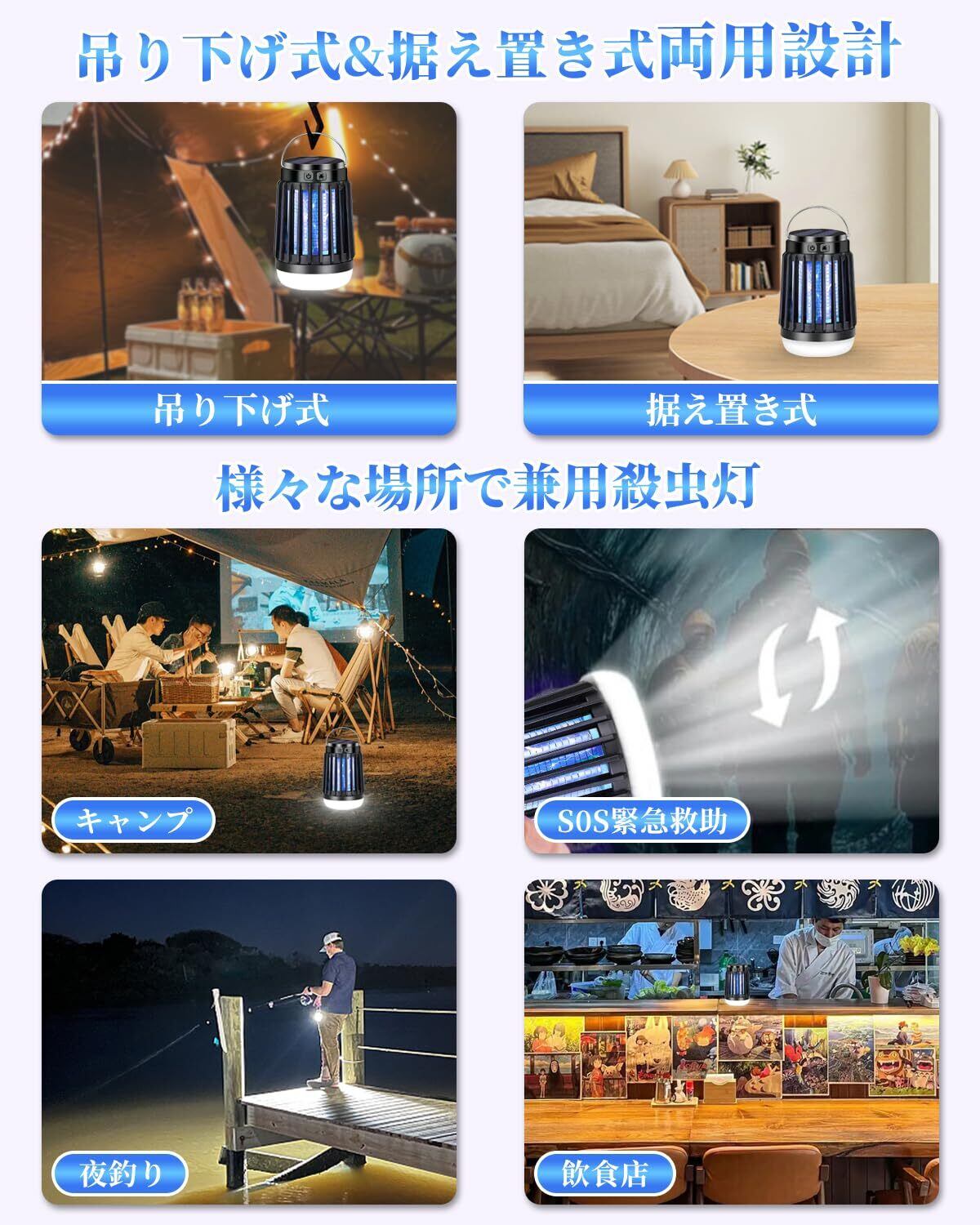 【吊り下げ&据え置き両用&幅広い用途】本品は手軽に持ち運べる電撃殺虫器なので、吊り下げと据え置きで使用できます。付属のフックで吊り下げて設置できます。室内だけでなく、屋外にも使用でき、便利にご使用いただけます。◆室内用:玄関、リビングルーム、子供部屋 ◆室外用:庭、海辺、公園、夜釣り、キャンプ、登山、旅行など ◆業務用:食料品店、食堂、民宿、作業現場、養鶏場、養豚場、ハウス栽培場など。