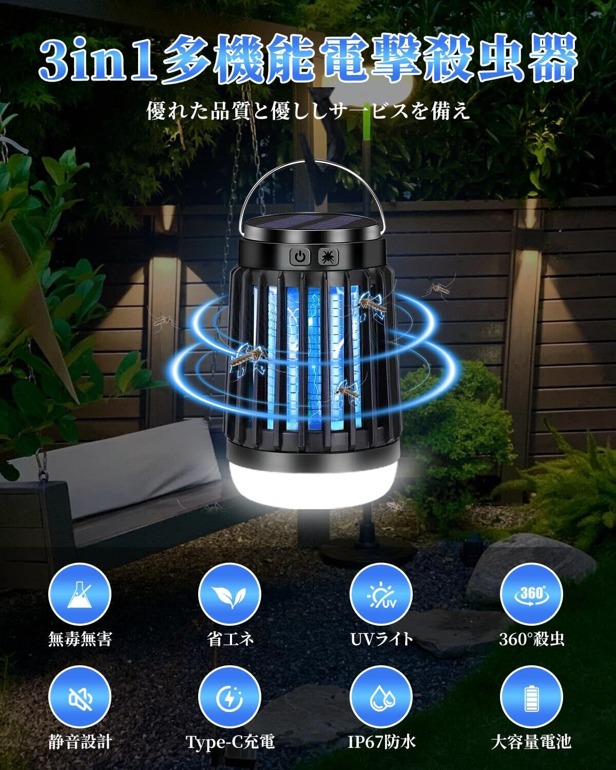 操作が簡単で!コンセントに挿すだけで使えますか、日なたに置いて充電するだけで、電撃殺虫器の上部に吊り下げフックが付いている、使いやすく設置できます。庭に吊り下げも可能、室内据え置きもでき、便利にご使用いただけます。本体の底に受け皿があるので、駆除された害虫は収納され、掃除用ブラシを使って、簡単に手を汚されず掃除できる。直接に蛇口下で製品中に残った蚊の死骸を洗い流すことができます、お手入れも非常に便利です。パッケージ内容:電撃殺虫器本体*1、2M充電ケーブル*1、日本語取扱説明書*1「出品者に連絡」までお問い合わせください。必ず最善を尽くし、ご対応いたします。