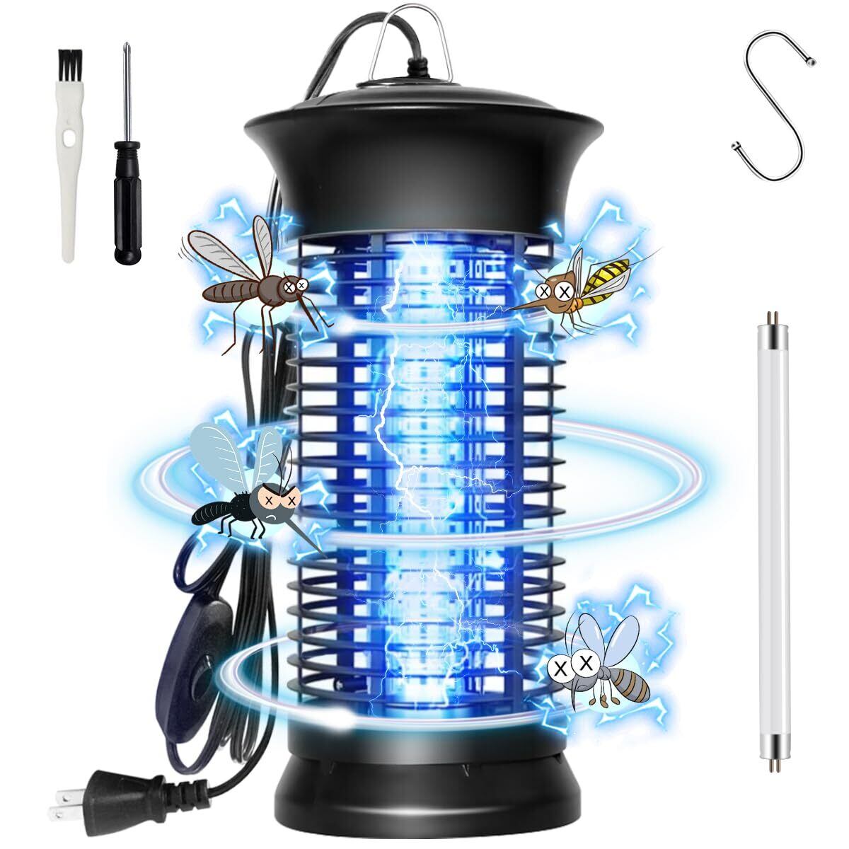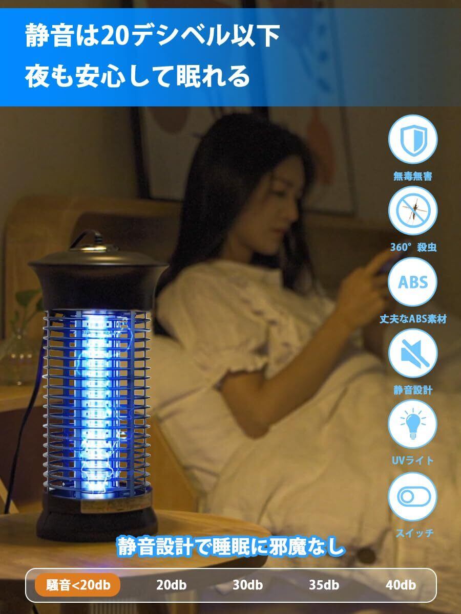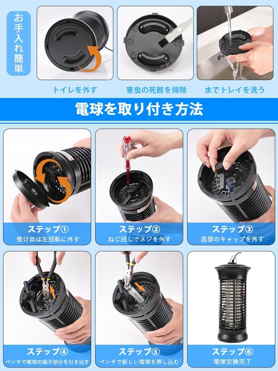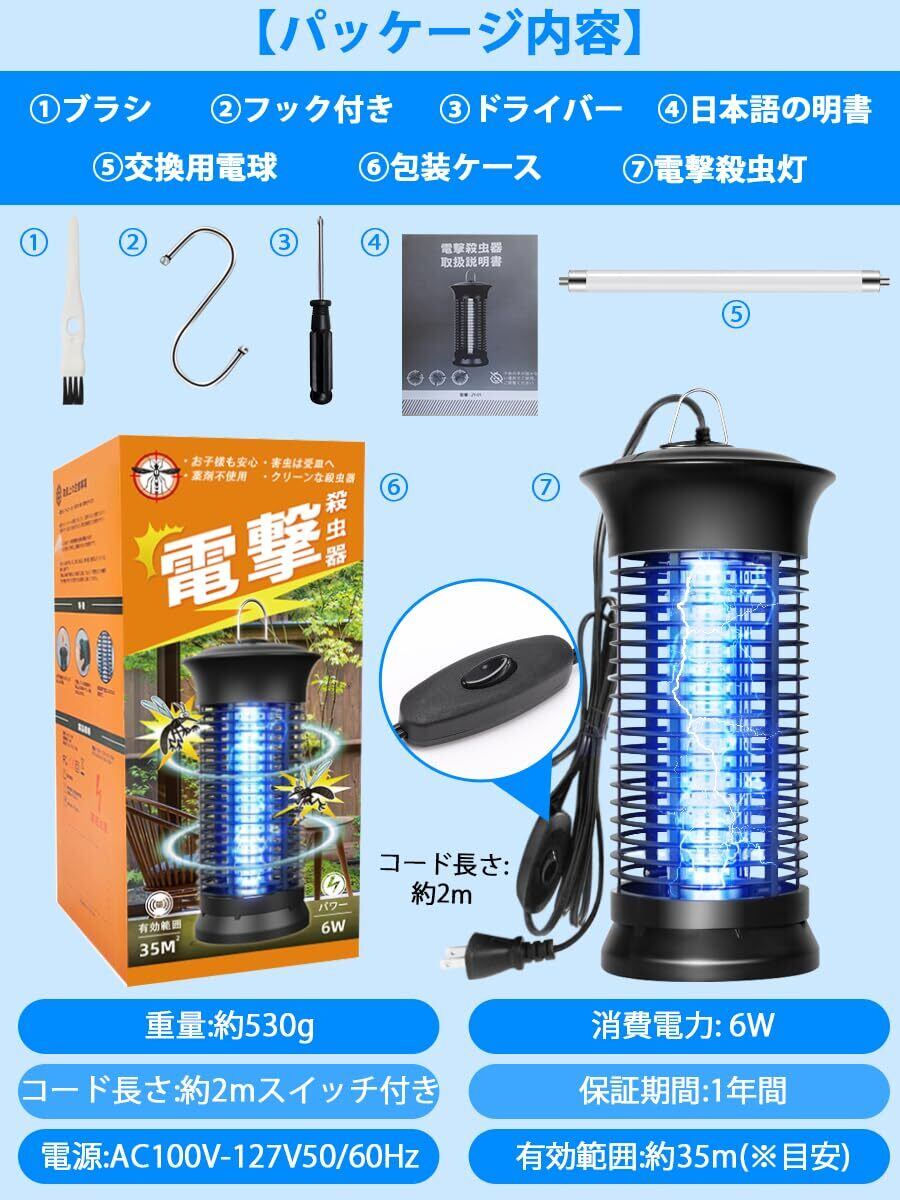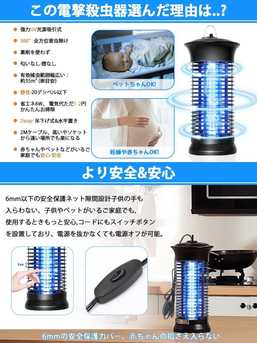 【2025最新進化した超強い電撃殺虫器、強力蚊除け、オリジナルの予備電球付き】改善点①:コードの長さを2メートルに延長。改善点②:コードにもスイッチボタンを設置しており、電源を抜かなくても電源オフが可能。より幅広い場合にご利用いただけるようになりました。6Wの補虫蛍光管を内蔵してパワーアップ、従来品より有効範囲が広がりまして、360°全方位スキャナーしたりして蚊などを誘惑します。その上に、予備電球としてオリジナルの電球をもう1本追加して、切り替えが簡単で使用寿命を倍伸ばすことができ、コスパが超高い殺虫灯LEDライトです。害虫が好む光に集まる習性を利用して、紫外線ライトで誘導して、害虫が内側の高圧電撃ネットを触れると瞬時に感電死させます。パシッとなどの騒ぎがなしに、火もなしに、内部には密集な静電ネット式な設計なので、虫などを逃げられないです。昼夜を問わずいつでも連続して静音で動作することができます。(殺虫効果向上のため、本電撃殺虫器を一定時間をご利用後ブラシ虫の死骸やホコリを清掃してください。)