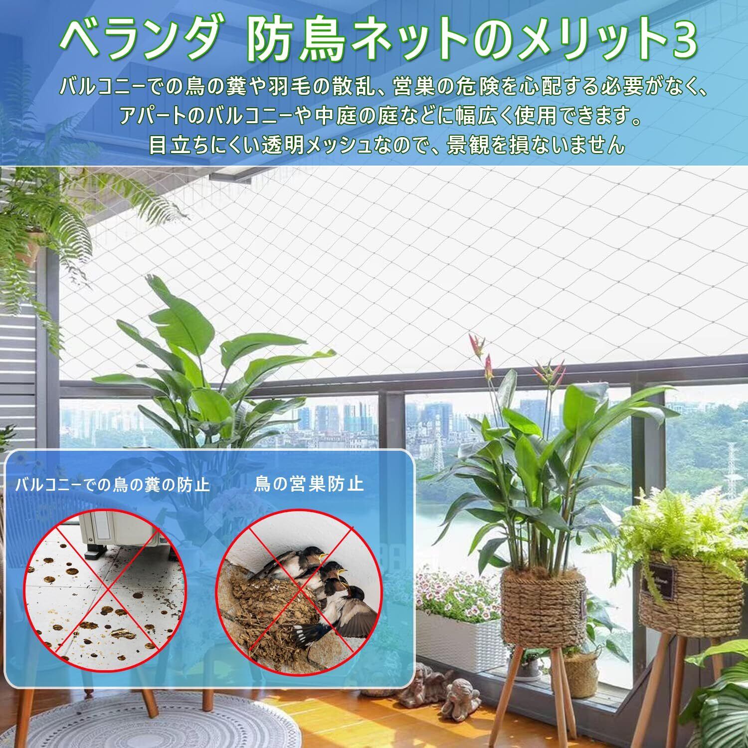 【透明色&防鳥ネット】 透明テグスの鳩よけネットは外から見ても目立たず外観の雰囲気を損ないません。目立たない鳥避けネット、通気性がよく、透明度が高いため、ベランダに取り付けても違和感がなく、外側の景観も損ないません。高品質で、軽量で、耐久性があり、無毒、靭性が強く、抗老化性強い、安全、繰り返し使用でき、使用寿命が長い、長時間使用しても色あせや剥がれがありません。自由にカットが出来ますので、湾曲している箇所や細かい部分の隙間など用途に合わせてお好みのサイズに調整できます。