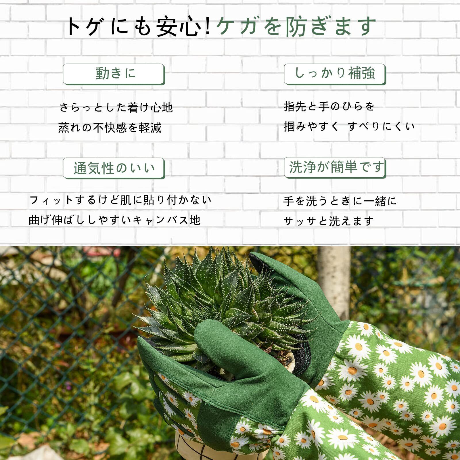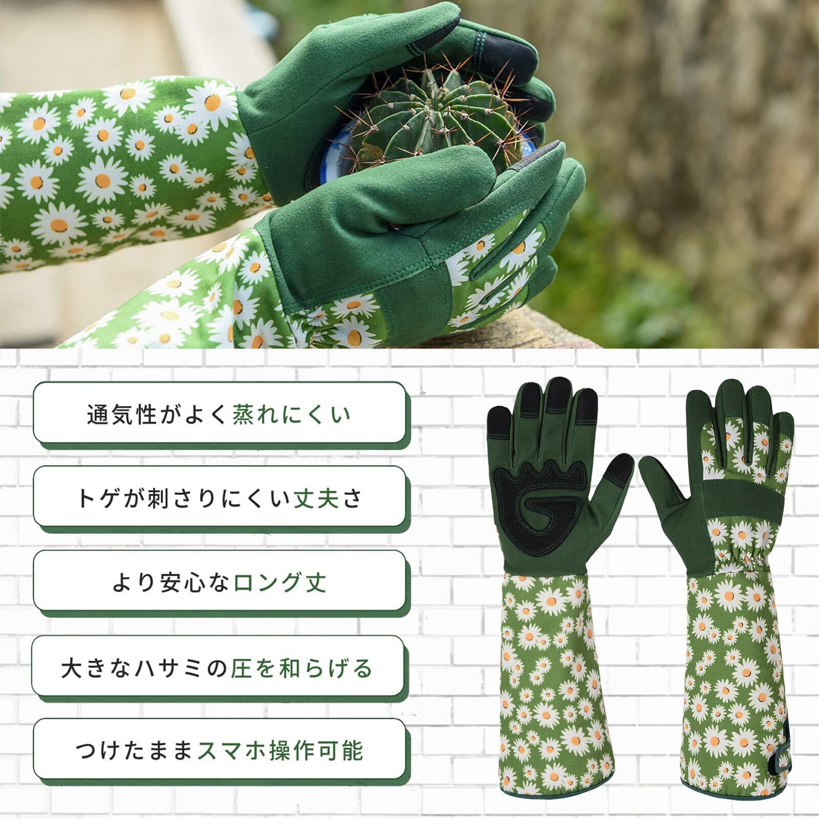 デザイン: 緑地にデイジー柄がプリントされた長袖ガーデニング手袋で、手首から腕までしっかりカバー