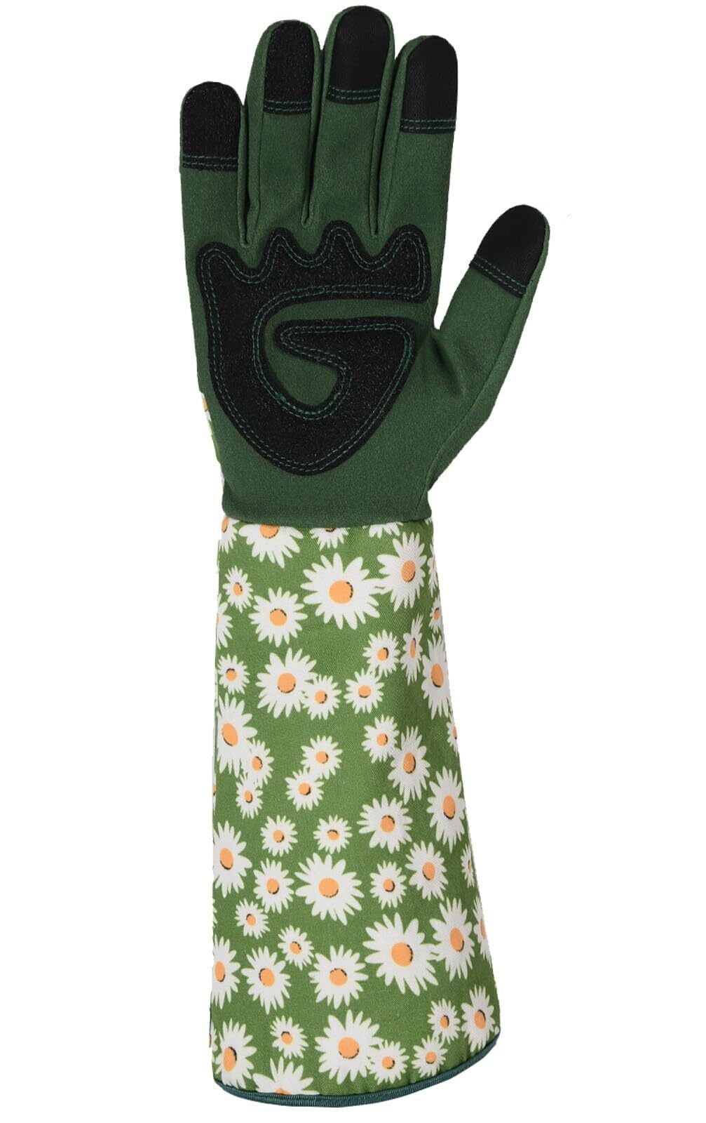 美しいデイジー柄が特徴的な、この長めのガーデニング手袋は、園芸作業を楽しく優雅にする必需品です。グリーンをベースにした手袋部分は耐久性があり、手のひら部分には黒い補強パッドが付いており、グリップ力を高めています。指先までしっかりとフィットする設計で、細かい作業も快適に行えます。バラの剪定や一般的な園芸作業に最適な長さで、腕をしっかりと保護します。手袋全体にあしらわれた可愛らしいデイジー柄は、実用性だけでなく、ガーデニングの楽しさを演出してくれます。タッチスクリーン対応の指先設計により、スマートフォンの操作も手袋をしたまま可能です。サイズは一般的な女性の手に合わせて設計されており、伸縮性のある素材で快適なフィット感を実現しています。手洗い可能で、普段のお手入れも簡単です。