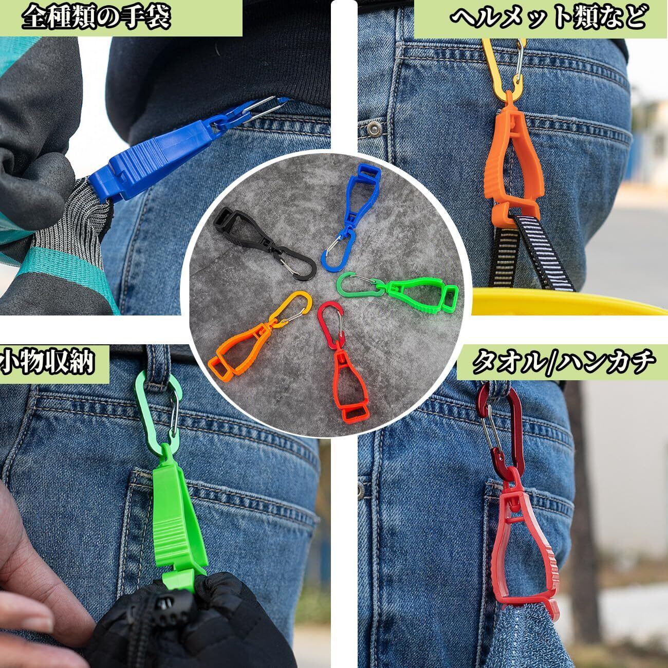 【使いやすさにこだわったデザイン】4個セットでのご提供となるため、ご家庭や職場で複数の手袋をしっかり管理できます。カラビナクリップをバッグやベルトループなどに取り付けることもでき、持ち歩きも簡単です。手袋の収納に最適なアイテムです。