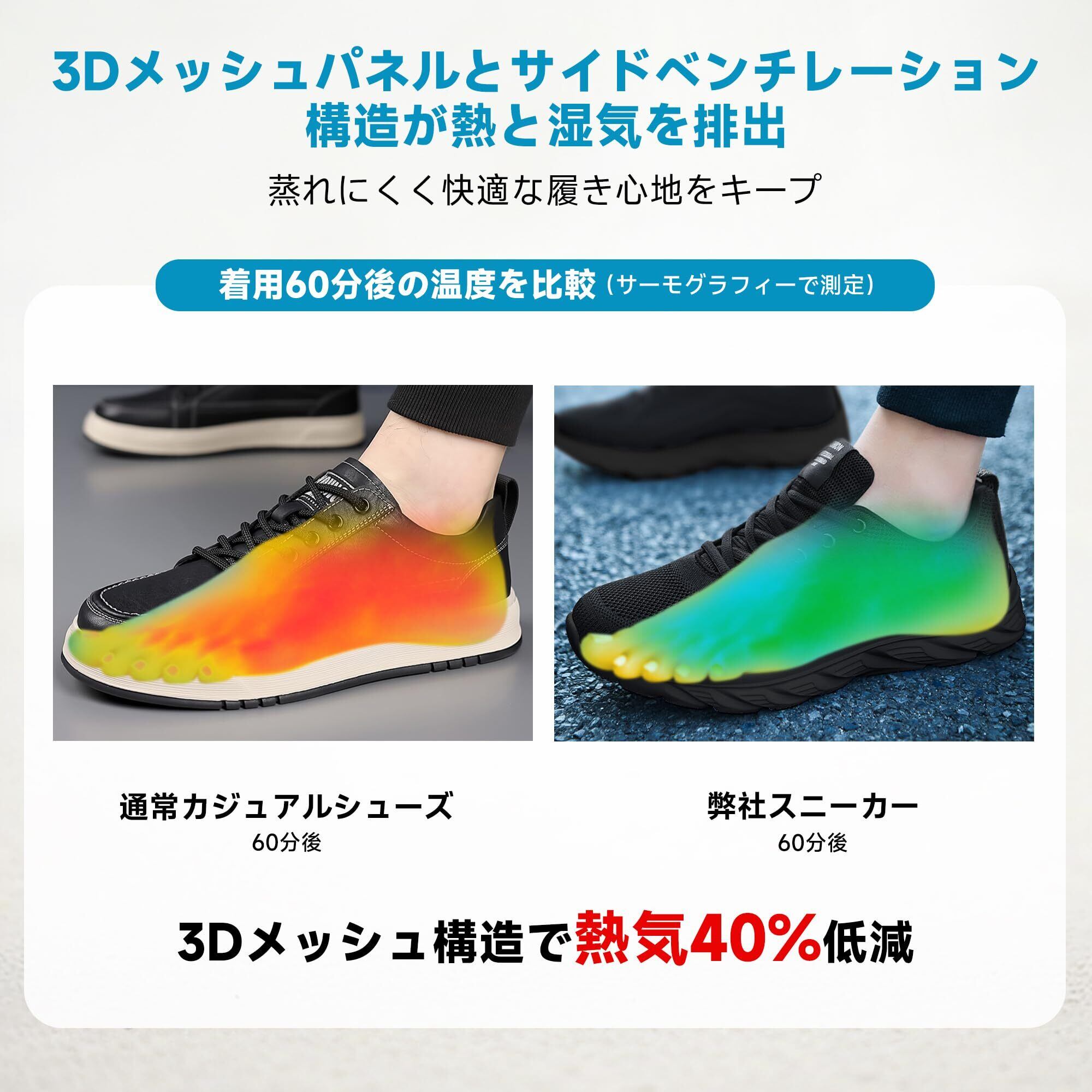 メッシュ素材で通気性抜群: 3Dメッシュパネルとサイドベンチレーション構造が熱と湿気を排出。蒸れにくく、快適な履き心地をキープします。