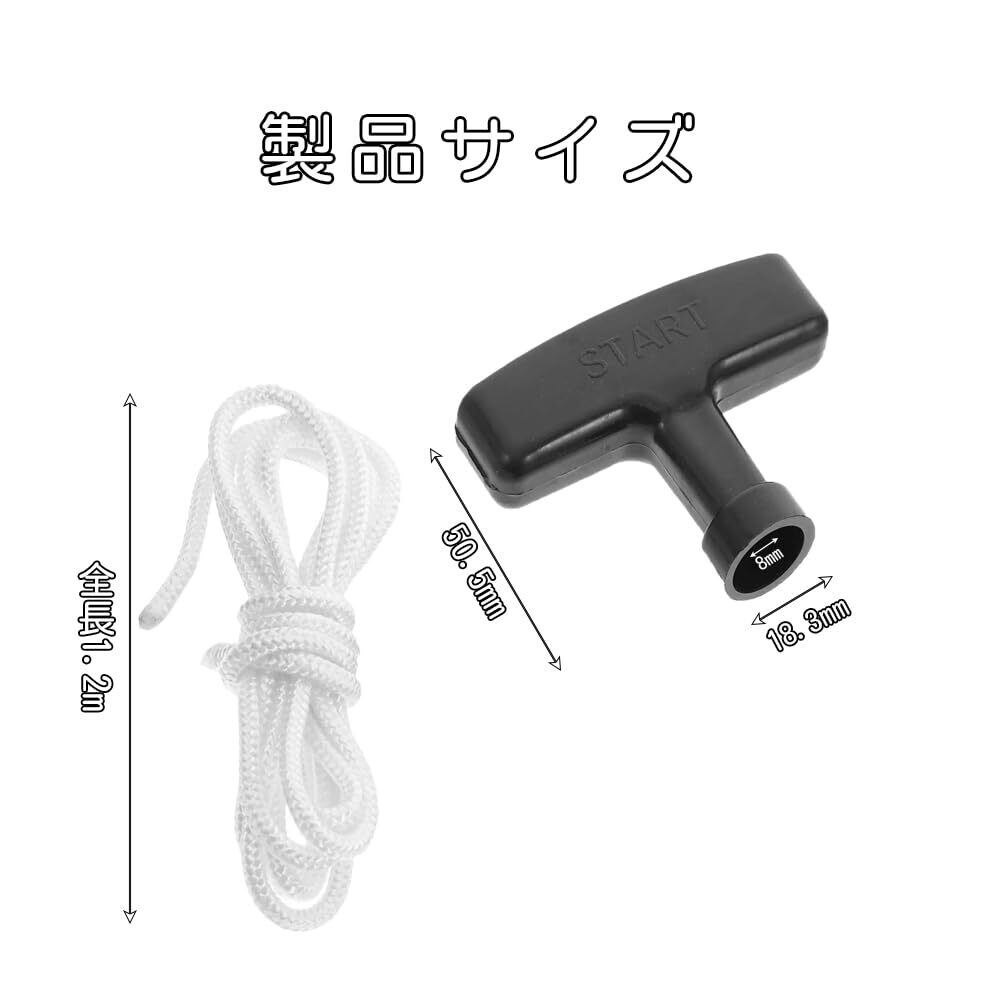 1. 【材質構成】 グリップ部:強化ABS樹脂(耐衝撃・耐油性) ロープ:高強度ナイロンコア(伸縮率15%以内) 2. 【基本仕様】 セット内容:スターターハンドル×2 + 専用ロープ×2 ハンドルサイズ:7cm×5.3cm ロープ仕様:長さ120mm × 幅3.5mm 3. 【人間工学の最適化】 3点支持グリップ:引張力40%軽減 R角処理:手のひら負担を低減 4. 【万能適合性能】 機器タイプ代表機種例 小型エンジン 草刈機・チェーンソー 発電機 家庭用~業務用5kVA 除雪機 単気筒~2気筒モデル 農業機械 管理機・耕運機 5. 【強化耐久性】 耐摩耗テスト:10,000回引張試験クリア