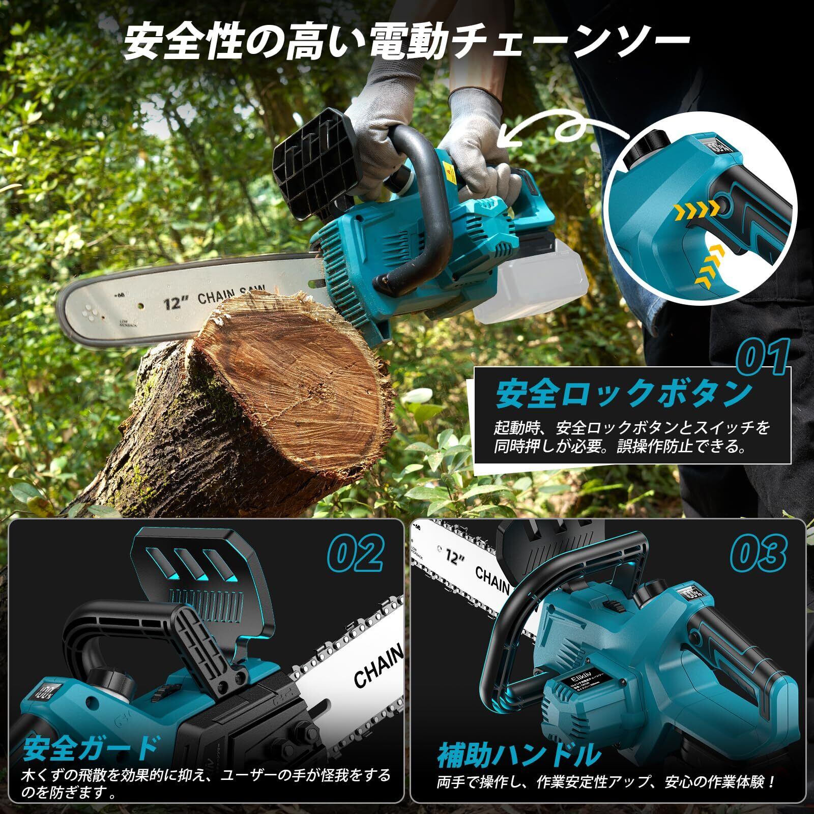 【12 インチ高切断力の充電式チェーンソー】弊社製品は革新的なブラシレスモーターを採用し、わずか 10 秒で直径 350mm の丸太を切断でき、時間とエネルギーを大幅に節約できます。そのブラシレスモーターにはたくさんの魅力があります。① 安全性抜群:火花や煙が出ないので、安全に使えます。②長寿命:ブラシ交換不要で、耐久性が高く、安定した性能を維持します。③ 省エネ高出力:エネルギー消費が少なく、1 つのバッテリーでも長時間使えます。④作業性能安定:振動が少なく、作業効率と精度が高まります 。本体重量はわずか 2kg!家庭の DIY プロジェクトから樹木の伐採まで、あらゆる作業に対応できる万能ツールです。さらに専用の収納ケース付きで、軽量設計のため持ち運びも大変簡単です。️ドライブリンク数:45 コマ。替刃を購入する場合は、この商品(ASIN:B09STZXHFF)をご注文ください。