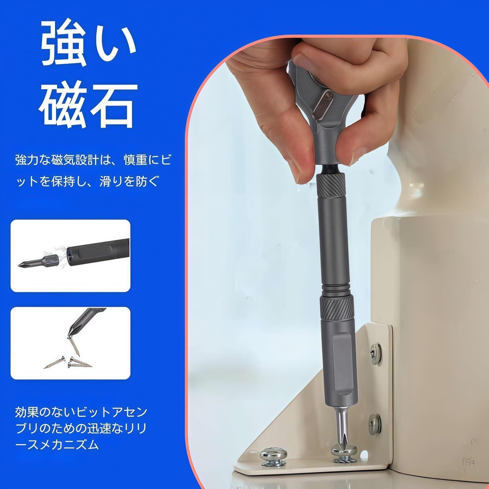 【便利な磁気式設計】内蔵された磁気機能により、ビットがしっかり固定され、作業中に外れる心配がありません。これにより、作業効率が向上し、ストレスフリーで安心して使用できます。