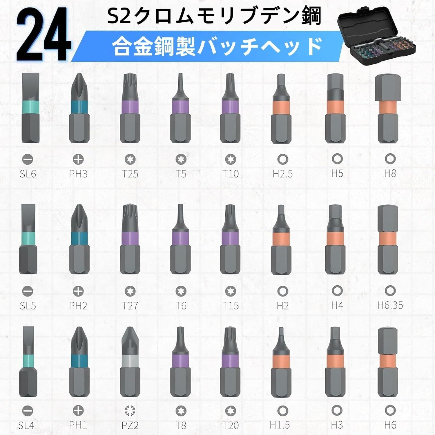 24種類の多用途ビットセット:高品質S2磁性クロームモリブデン合金鋼製の24種類のビットを同梱。家庭用DIY、自転車修理からプロのメンテナンスまで、様々な作業に対応する万能工具セットです。