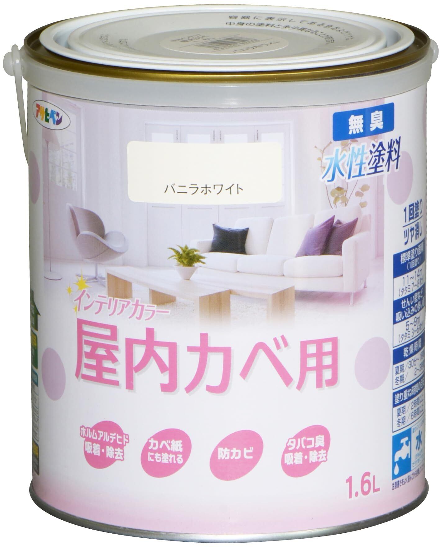 アサヒペン NEW水性インテリアカラー屋内カベ用 1.6L バニラホワイト 塗料 ペンキ 室内 壁用 ツヤ消し 1回塗り 無臭 防カビ 低VOC シックハウス対策品 日本製