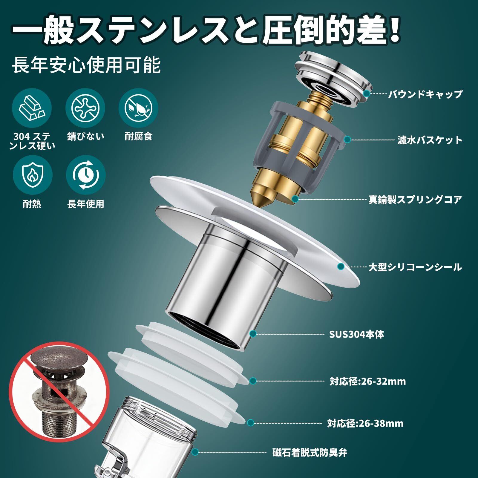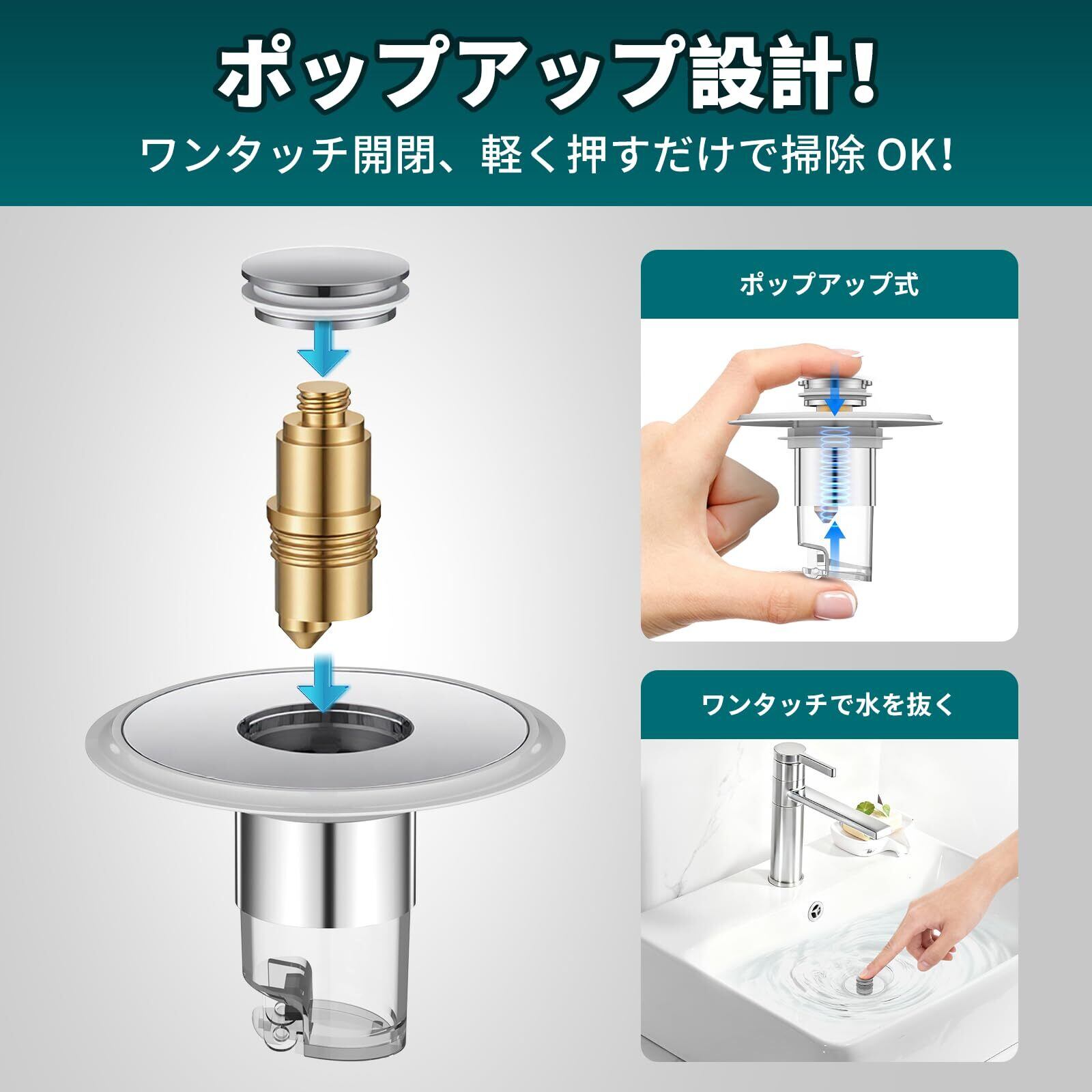 【在庫処分】洗面台 ゴミ受け 洗面台排水口ポップアップ 洗面所 排水栓304ステンレス ゴミ受け プッシュ式 ワンプッシュ開閉 洗面台ヘアキャッチャー 排水口 ゴミ受け フィルター内蔵 26〜48mm対応 防臭・防虫 高密閉・漏れ防止 簡単取付け・取り外し