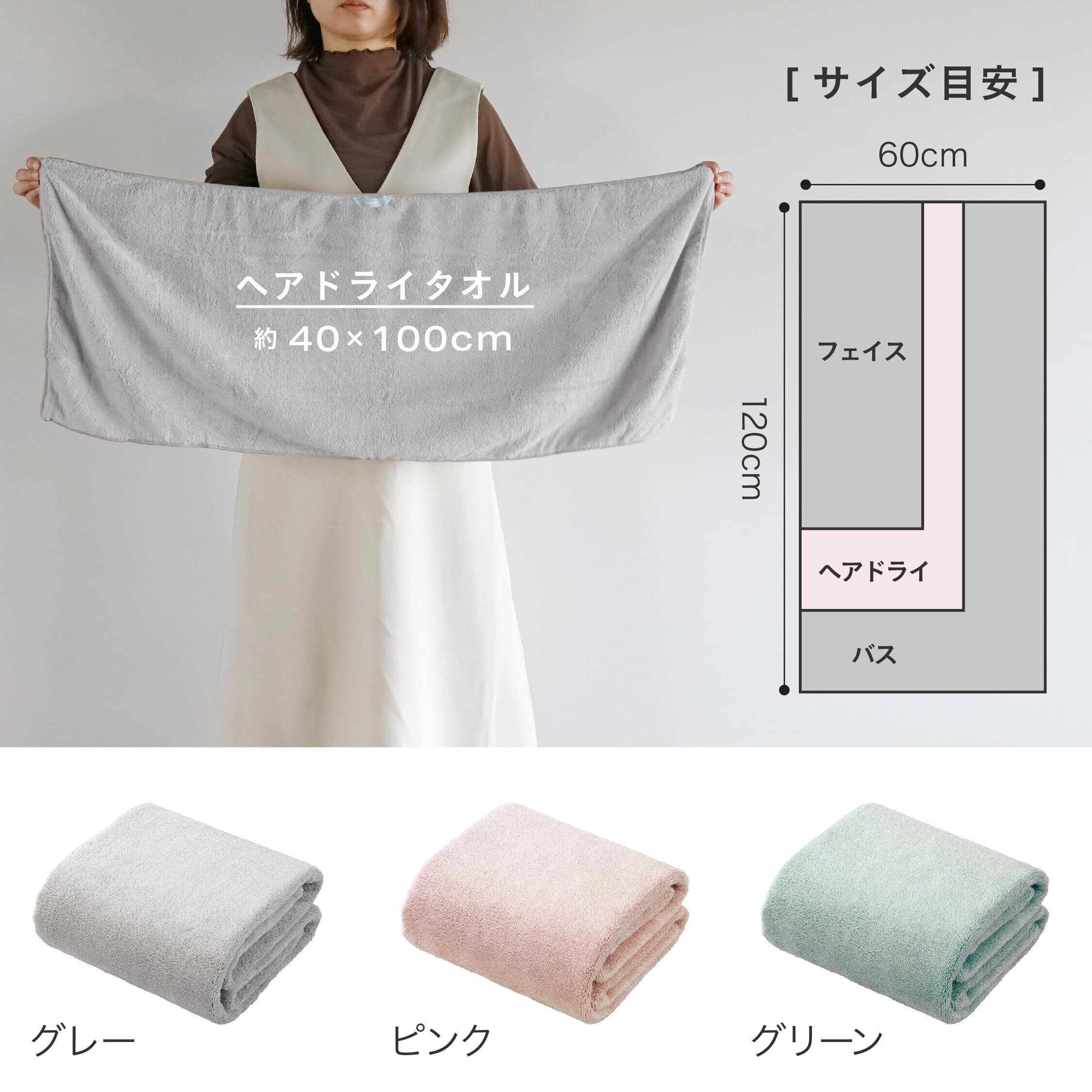 濡れた髪に軽く押し当てるだけで水分を吸収してくれるので、摩擦を減らしてダメージの軽減にも繋がります。ロングヘアの方のヘアドライはもちろん小さめのバスタオルとしても使えます。