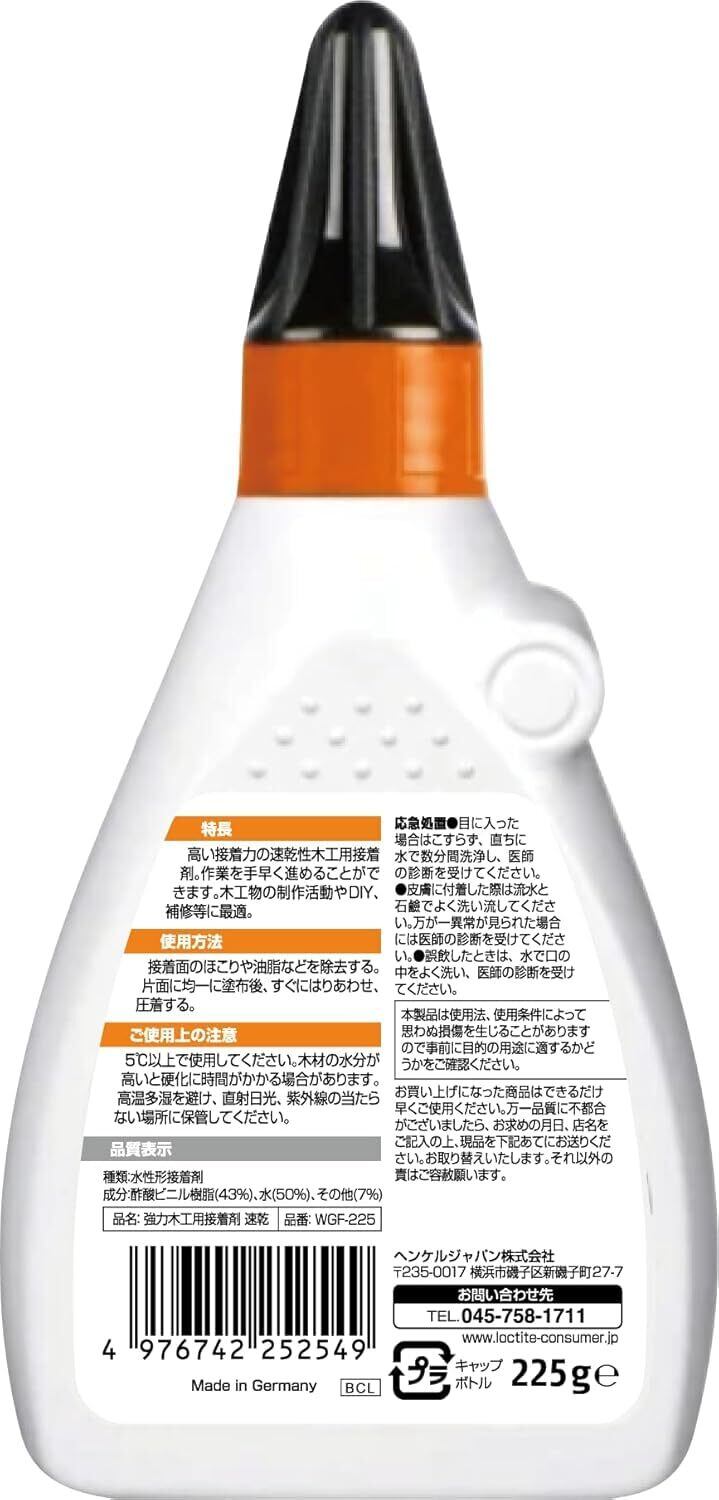 DIYやプロの木工作業に最適な頼れるパートナー!【新着商品】LOCTITE(ロックタイト) 強力木工用接着剤 速乾 225gは、優れた接着力とスピーディな乾燥時間を実現した、木工用接着剤の決定版です。