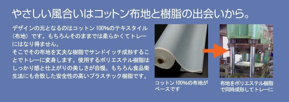 おしゃれ心いっぱいのテキスタイルと、耐水性に優れ、食品衛生法にも合致したリードフリーの安全な樹脂と塗料で作ったテキスタイルトレイ。 ●持ち手部分を省く事により、トレーの隅々まで使えるようにデザインされたスクエアタイプのトレー。トレーとしてだけでは無く、お料理と一緒にレンジで暖めた後はテーブルまで運んでランチョンマットとしてもご利用頂けます。 ●同じ柄の別サイズのトレーもございます。お揃いで揃えればお食事の時間がもっと楽しくなります。 ●テキスタイル(布地)ならでの風合いをそのままに、機能性を追求したトレーです。 ●「日本三大漆器」に数えられる、お盆の産地「紀州漆器(和歌山県海南市)」の技術で作られた、日本製の製品です。
