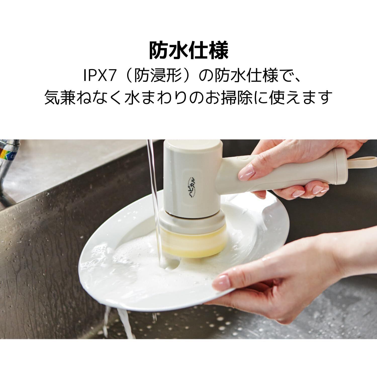 IPX7の防水仕様で気兼ねなく水まわりのお掃除に使えます。