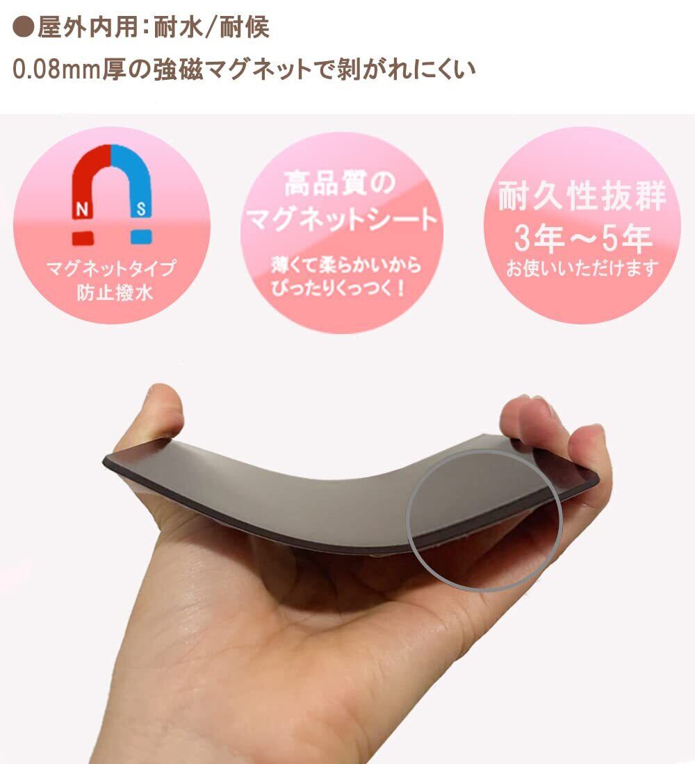 鉄製のドアや玄関ポスト、宅配BOXなどマグネットがつく場所につけて使えます。マグネットだからつけはずしも簡単。 耐候・耐水性に優れた材料を使用。雨に濡れても安心・安全、サッと拭くだけで汚れも落ちますので 特殊なアクリル板を使用していますので丈夫で長持ちするのが特徴です。