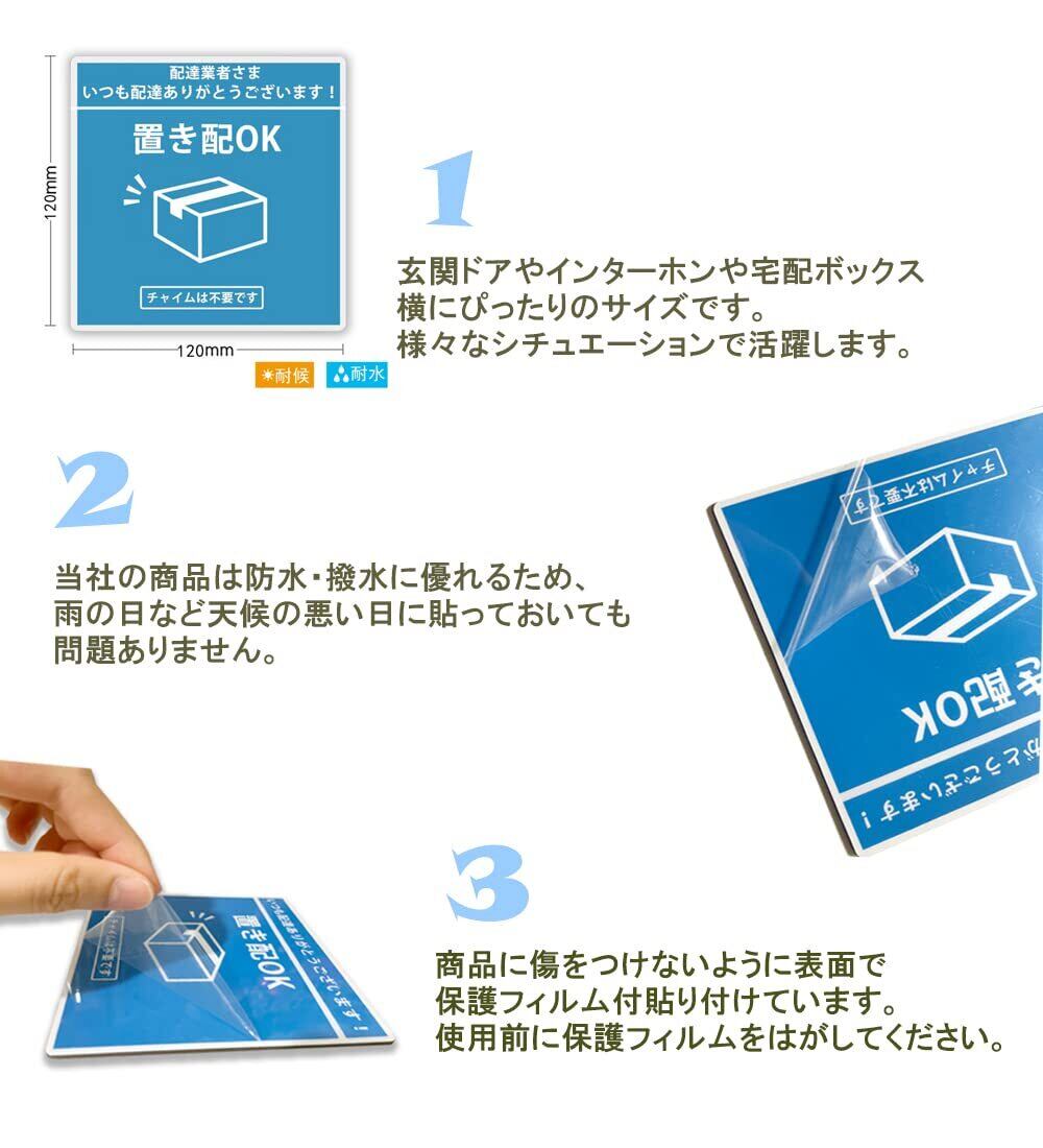 玄関ドアに貼るだけで置き配依頼ができる便利な置き配OK マグネットです。配達員さんのみに知らせます。マグネットなので必要に応じて貼ったり剥がしたり使い分けできます。ご注意:商品に傷をつけないように表面で 保護フィルム付貼り付けています。 使用前に保護フィルムをはがしてください。